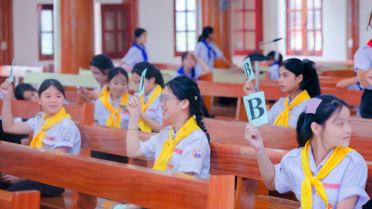 Tiếp nối là cuộc thi “Rung Chuông Vàng” diễn ra thật hào hứng. Mỗi câu hỏi được đưa ra đều mang đến bầu khí hồi hộp, gay cấn và tiếng cổ vũ sôi động. Đây không chỉ là sân chơi kiến thức, mà còn là dịp để các em thể hiện sự nhanh nhẹn, trí tuệ cùng bản lĩnh tự tin của mình.