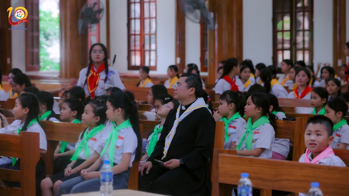 Nghi thức chào cờ được cử hành trang nghiêm, mở đầu cho chuỗi hoạt động sôi nổi. Cha xứ Giuse Nguyễn Trung Thông nhắn nhủ các em hãy sống tinh thần Thiếu Nhi Thánh Thể không chỉ hôm nay, nhưng trong hết các ngày sau này.