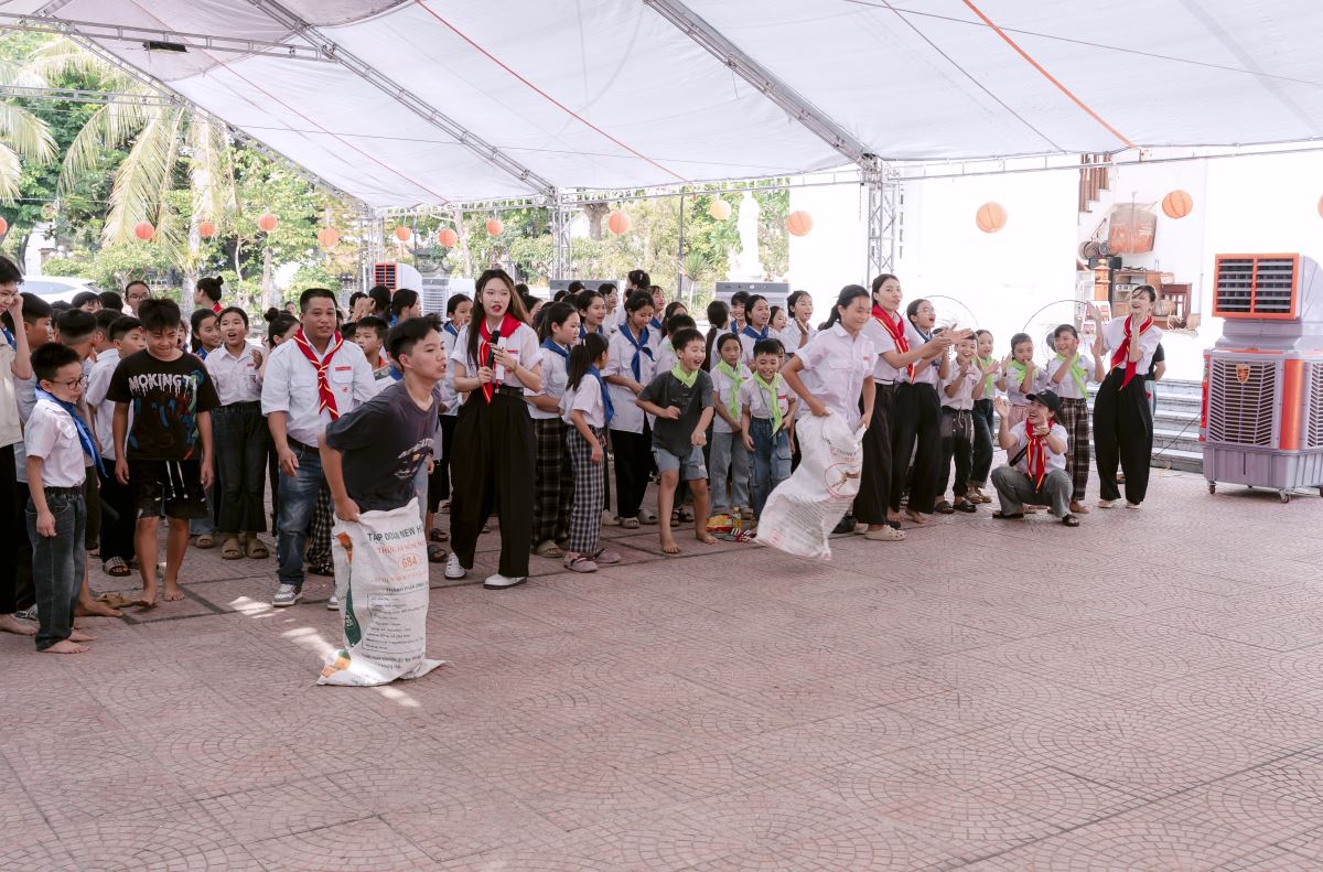 Sau phần khởi động, các em bước vào chuỗi trò chơi đồng đội vui nhộn. Từ những thử thách vận động đến các trò chơi trí tuệ, tất cả đều diễn ra trong tinh thần đoàn kết và sẻ chia. Tiếng reo hò cổ vũ vang lên khắp sân nhà xứ, mang đến một buổi chiều ngập tràn tiếng cười và tình thân ái.