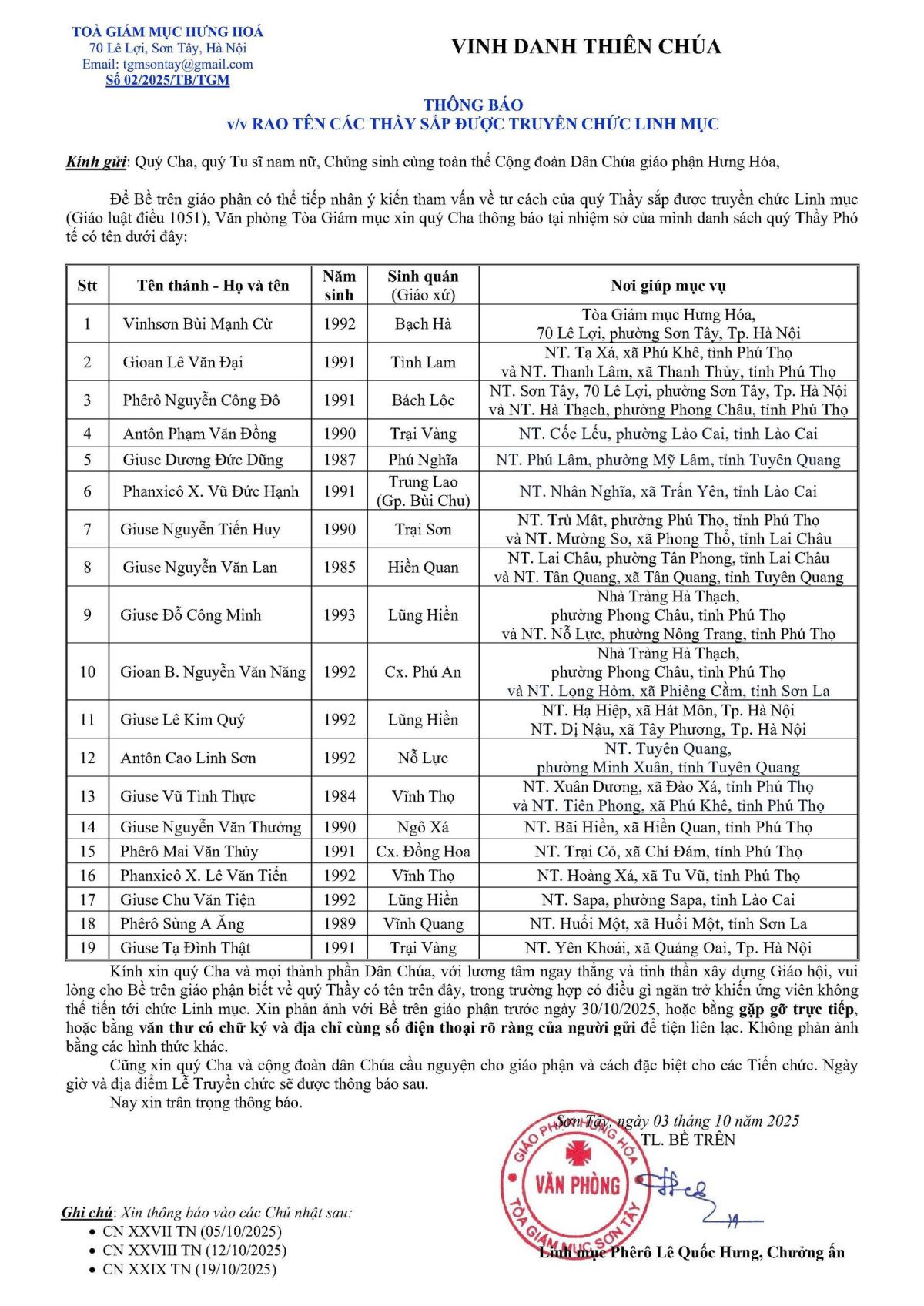 Thông Báo Về Thánh Lễ Truyền Chức Giám Mục Phụ Tá Giáo Phận Hưng Hóa