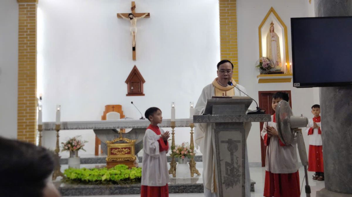 Sau phần dâng hoa, cộng đoàn cùng hiệp dâng Thánh lễ kính các Thánh Nam Nữ và tạ ơn bế mạc Tháng Mân Côi, do cha Giuse Dương Đắc Tiến chủ tế.