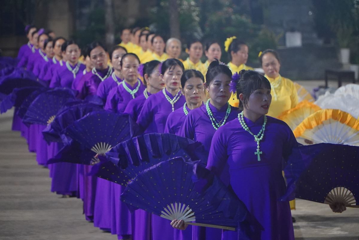 Trong bầu khí linh thiêng và trang trọng, vào lúc 19g15 tại sân quảng trường giáo xứ Hoàng Xá, 100 hoa viên là các bà, các chị đến từ giáo xứ Hoàng Xá cùng các chuẩn xứ Ba Đông, Tiền Phong và Minh Xuân đã cùng đồng diễn dâng hoa Kính Đức Mẹ.