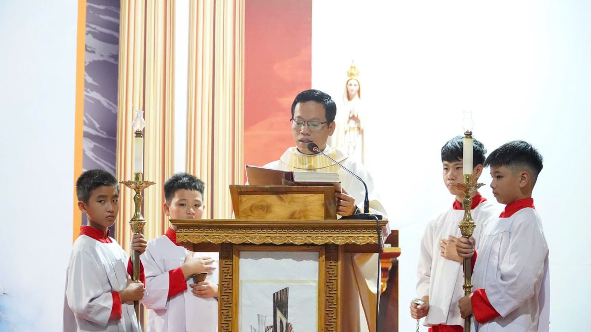 Kết thúc cuộc rước, cộng đoàn quy tụ trong ngôi nhà đa năng của giáo xứ để hiệp dâng Thánh lễ mừng kính trọng thể Đức Mẹ Mân Côi, do cha xứ Giuse chủ tế.