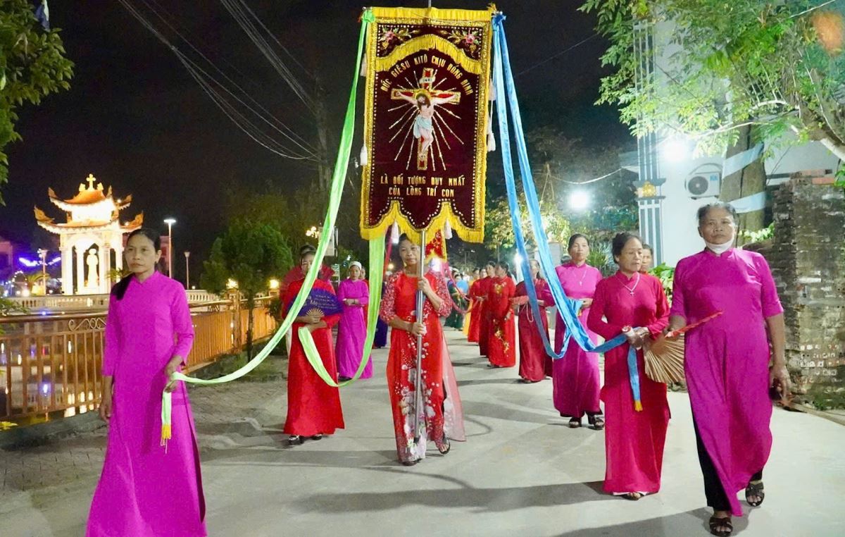 Đúng 19g00, sau hồi chuông ngân vang báo hiệu, cộng đoàn dân Chúa quy tụ đông đảo tại phía cuối ngôi nhà thờ cổ kính. Sau khi cùng nhau sốt sắng nguyện kinh, đoàn rước trang trọng tiến bước trong âm vang rộn rã của đội kèn đồng, hòa quyện với tiếng hát du dương của ca đoàn và lời kinh Mân Côi của toàn thể cộng đoàn.