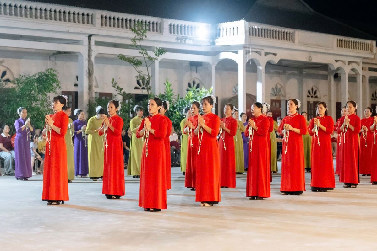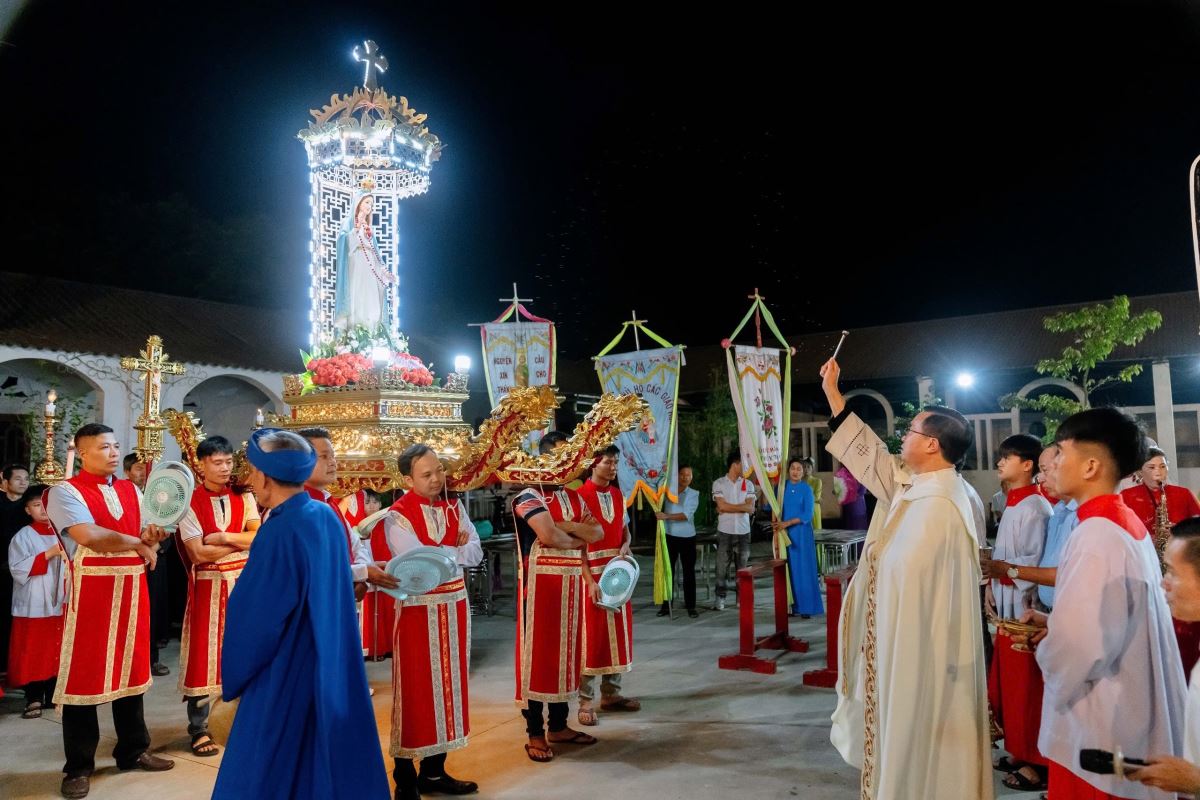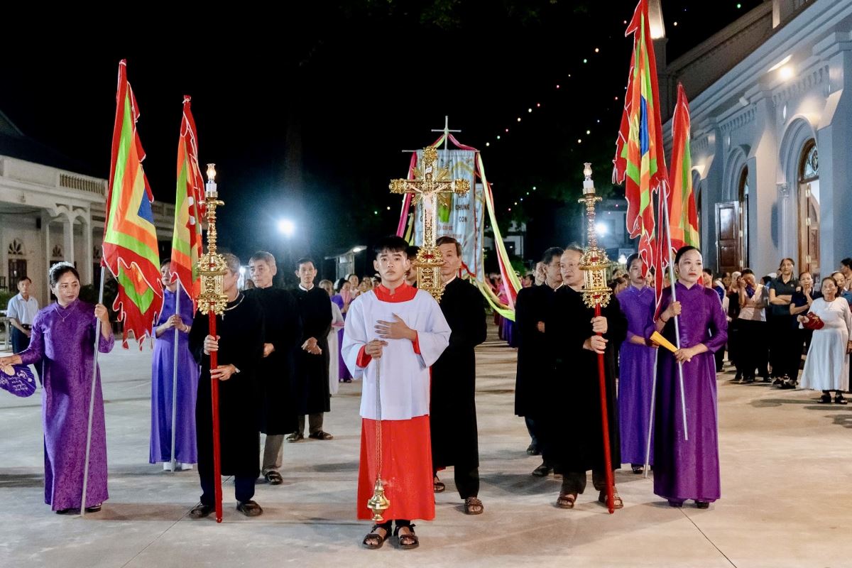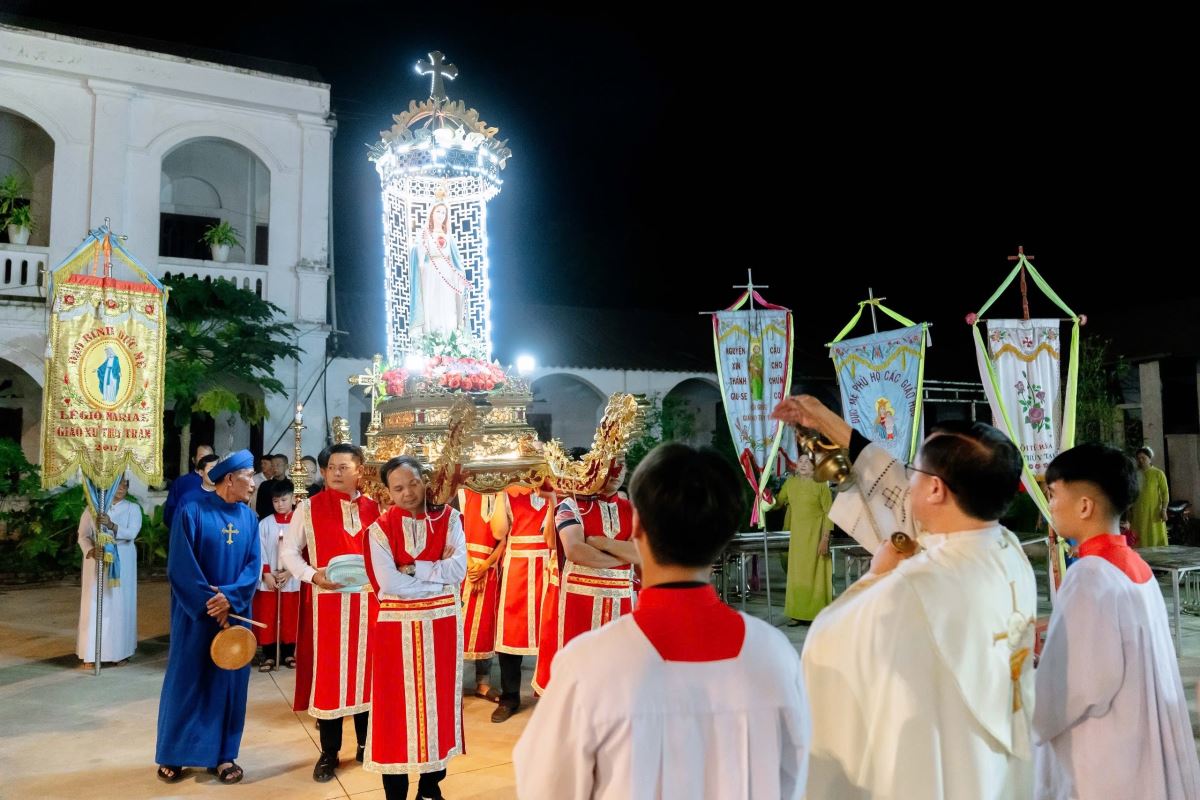 Sau giờ kinh nguyện, Cha xứ Giuse Vũ Công Phường chủ sự cuộc cung nghinh kiệu tôn vinh Đức Mẹ Mân Côi xung quanh khuôn viên nhà thờ. Cuộc rước kiệu diễn ra trong bầu khí linh thiêng và trang nghiêm, như lời tuyên xưng công khai niềm tin và lòng sùng kính của đoàn con cái dâng lên Mẹ Thiên Chúa.