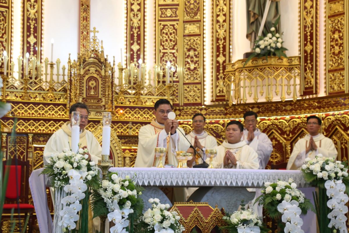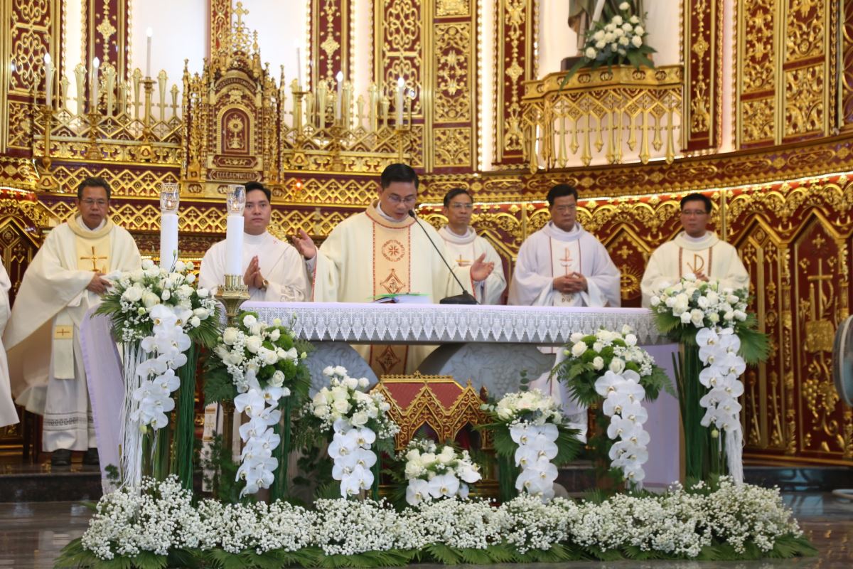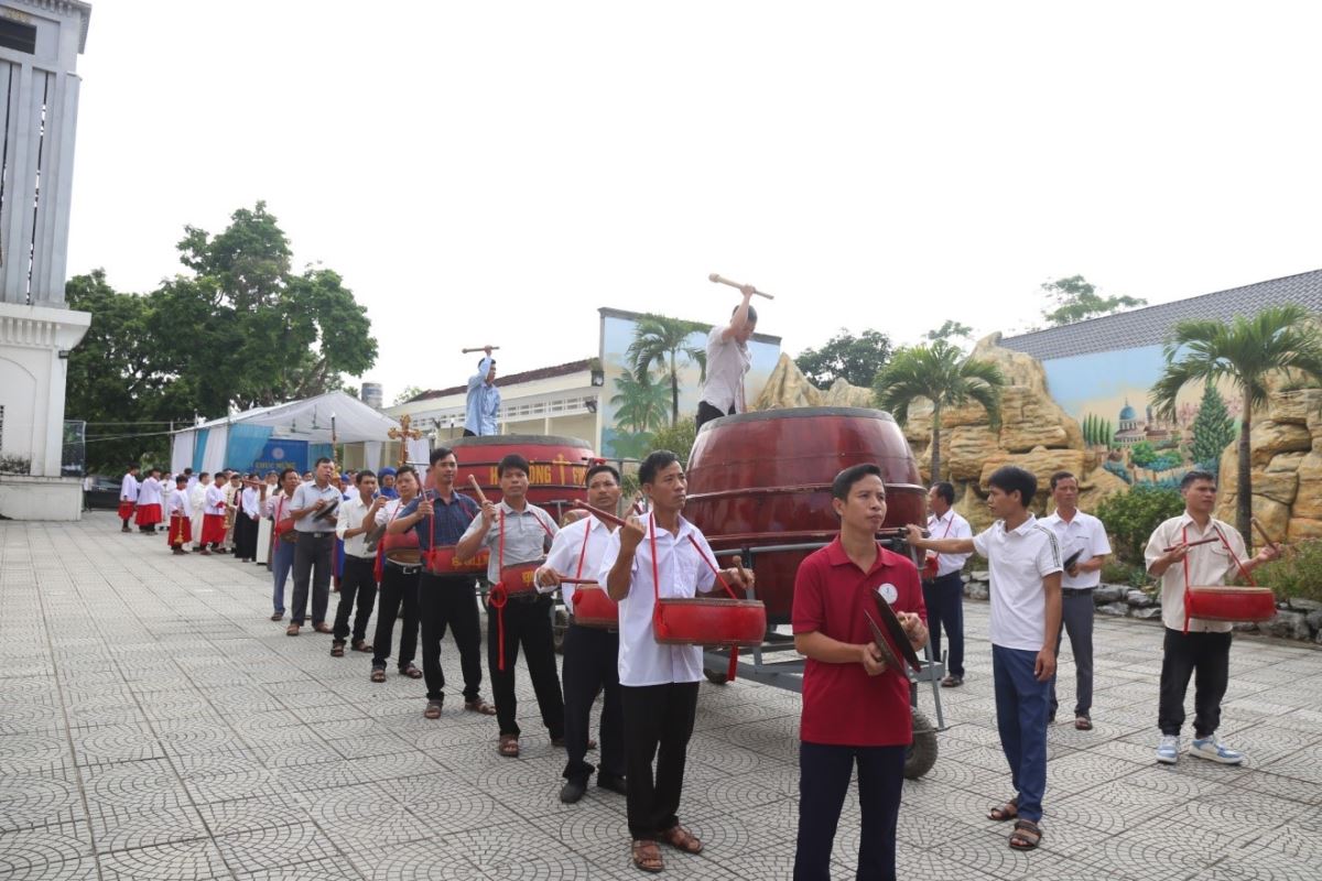 Đúng 08g25 phút, tiếng trống vang dội tấu lên cùng với giai điệu hân hoan của bài ca nhập lễ. Từ sân nhà, thờ đoàn đồng tế tiến vào thánh đường để hiệp dâng Thánh lễ tạ ơn, do Cha xứ Giuse Phan Văn Luật chủ tế.