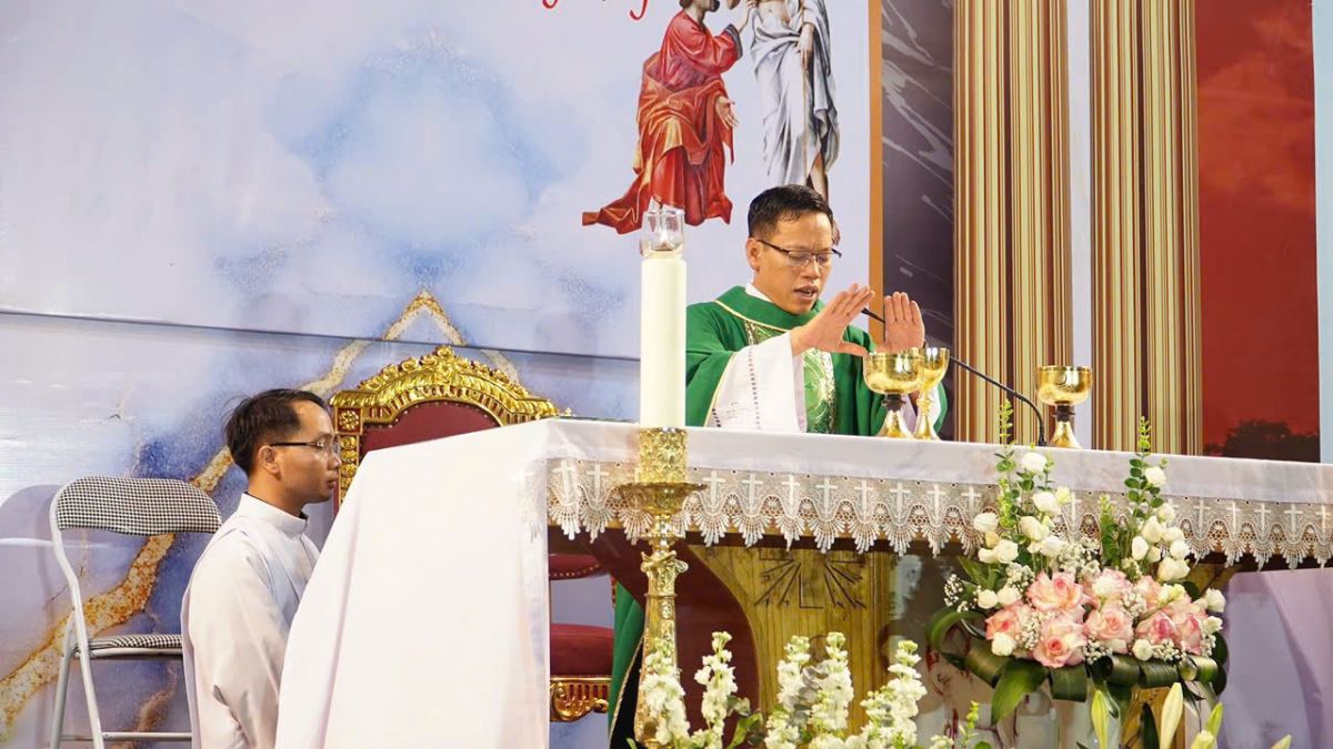 Cao điểm của ngày mừng lễ quan thầy là Thánh lễ tạ ơn do cha xứ Giuse chủ sự. Trong phần chia sẻ Lời Chúa. Dựa trên nền tảng của bài tin mừng (Lc 10,1 – 12.17 - 20) cha Giuse mời gọi các bạn trẻ cũng là những người được sai đi như bảy mươi hai môn đệ xưa. biết tích cực dấn thân trong công việc tông đồ, luôn là dấu chỉ sống động của tình thương Chúa giữa lòng thế giới hôm nay.