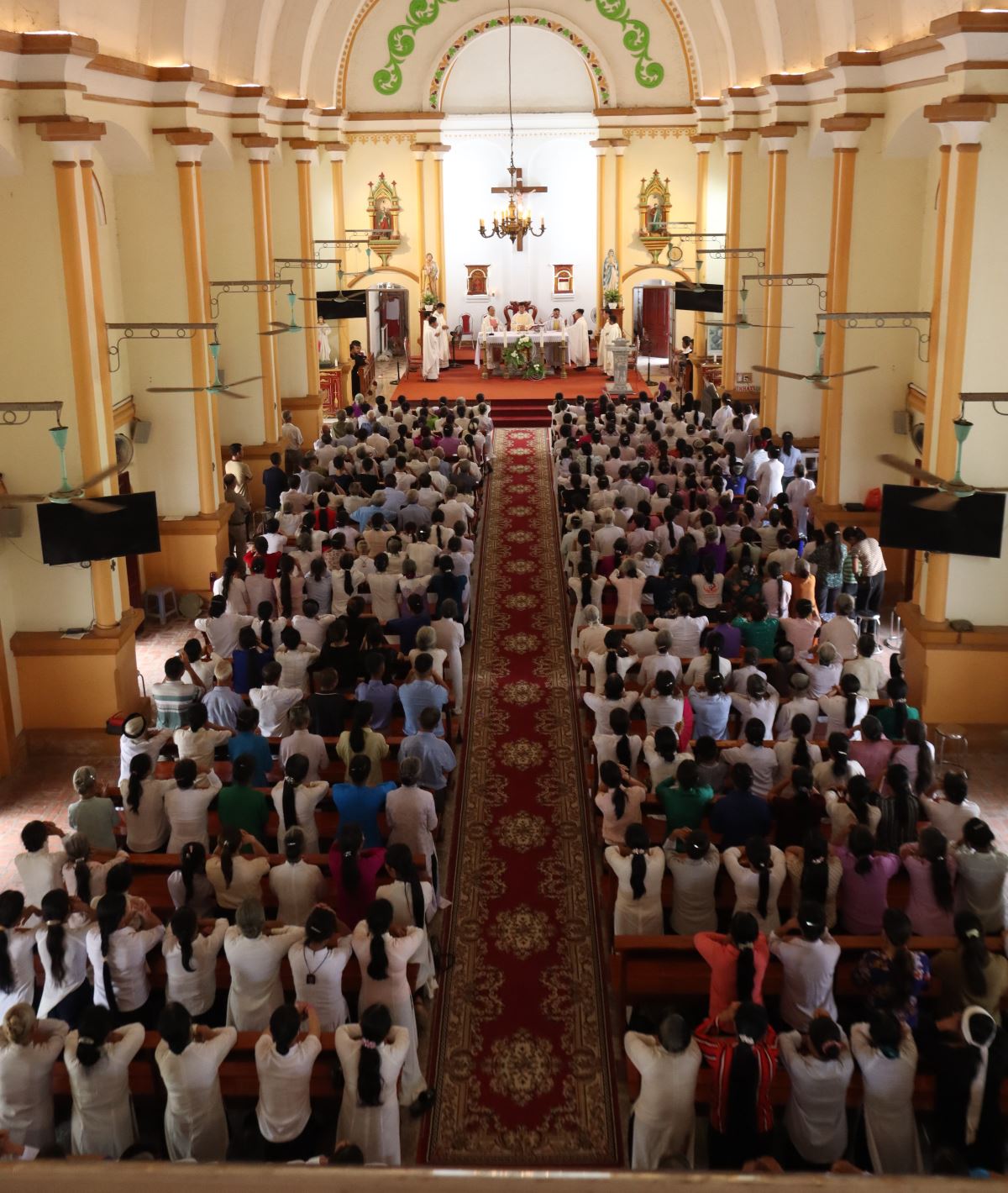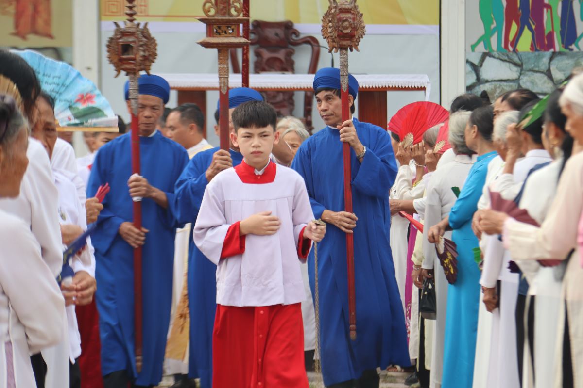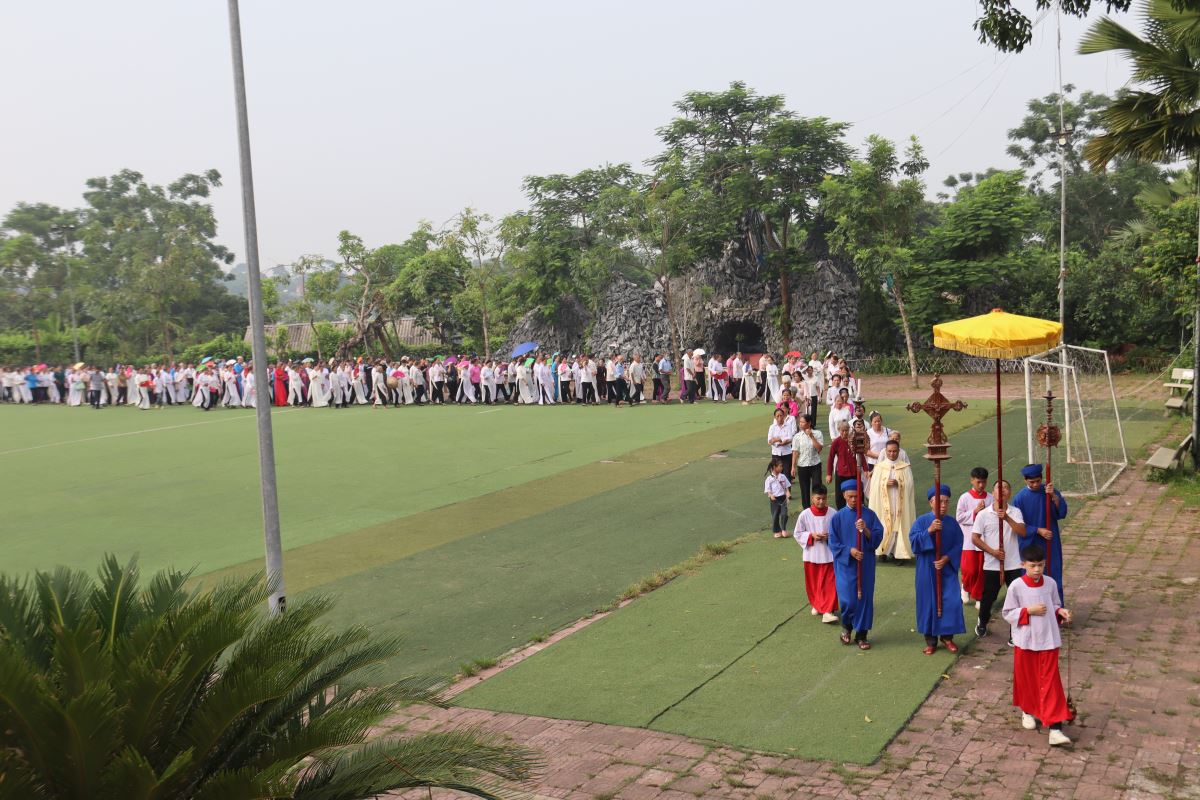 Trong tâm tình thánh thiêng, đoàn rước theo Thánh giá tiến vào nhà thờ, mở đầu ngày hành hương trong niềm tin tưởng và phó thác.