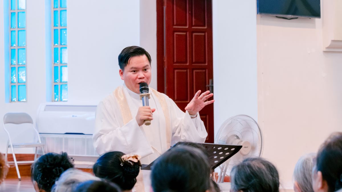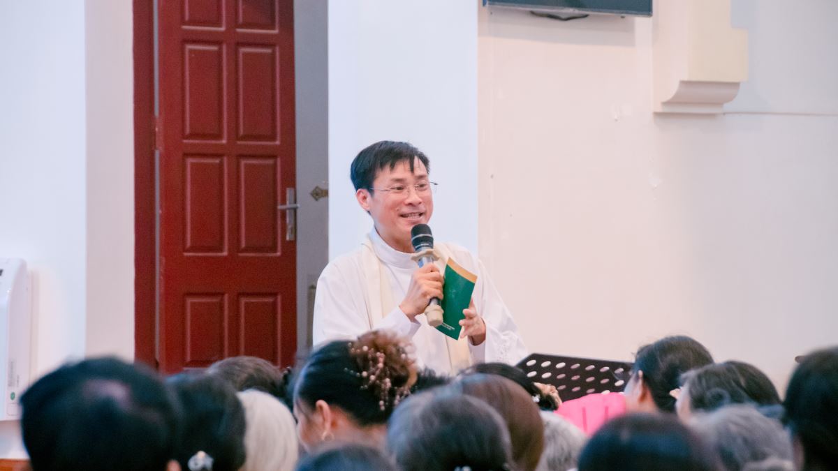 Sau đó, đoàn hành hương tiến vào nhà thờ để lắng nghe phần chia sẻ của cha Gioan Baotixita Nguyễn Hữu Tài, OP - Cha linh hướng Huynh đoàn. Cha Gioan Baotixita Nguyễn Hữu Tài, OP - Cha linh hướng Huynh đoàn chia sẻ |