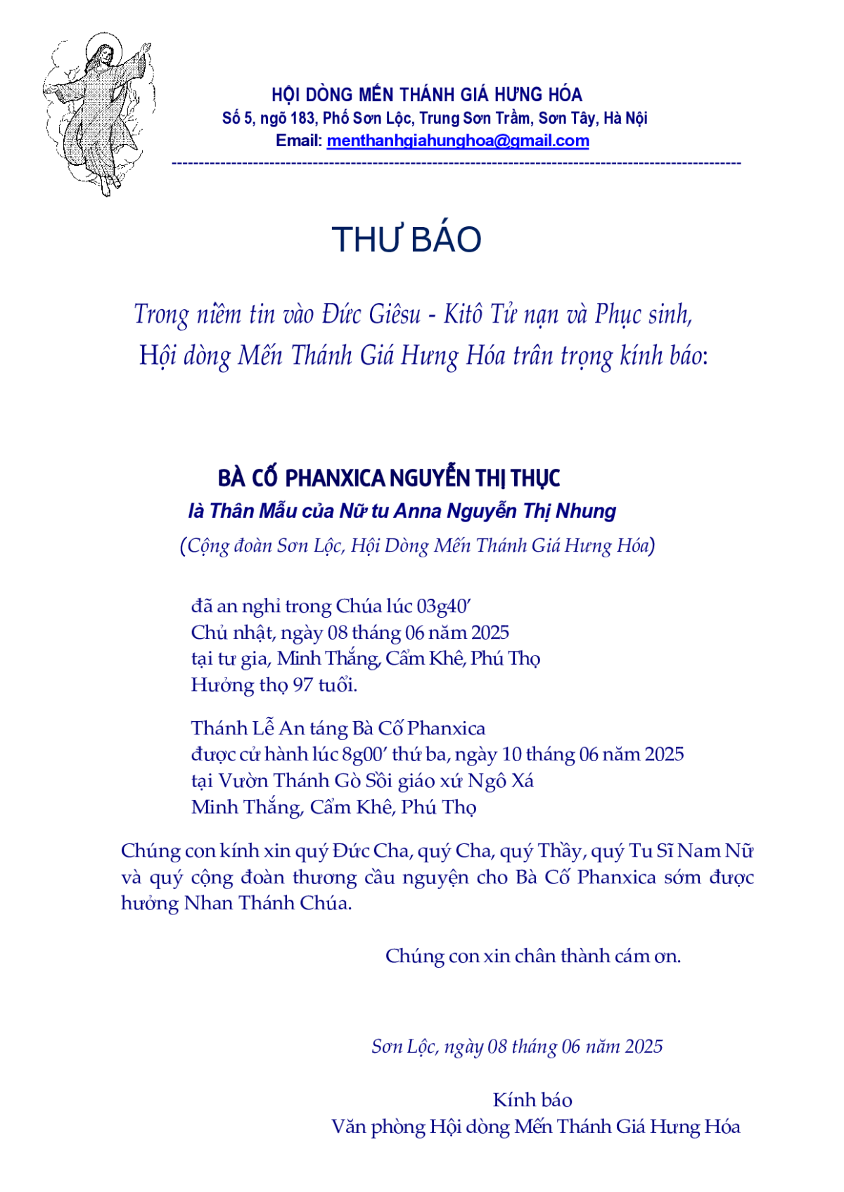 Cáo Phó Bà Cố Phanxica Nguyễn Thị Thục - Thân Mẫu Nữ Tu Anna Nguyễn Thị Nhung (Cộng Đoàn Sơn Lộc) - Hội Dòng Mến Thánh Giá Hưng Hóa
