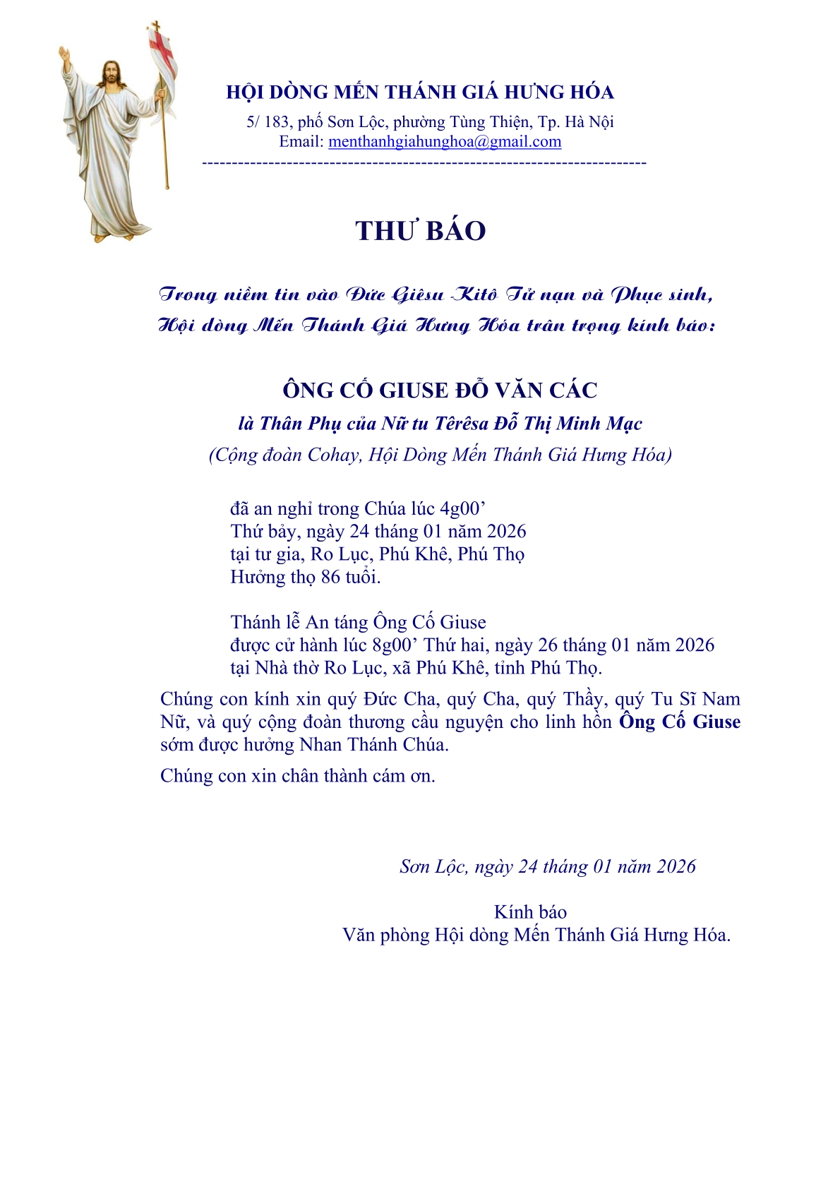 Cáo Phó: Ông cố Giuse Đỗ Văn Các | Thân phụ Nữ tu Têrêsa Đỗ Thị Minh Mạc (Cộng đoàn Cohay) - Hội dòng Mến Thánh Giá Hưng Hóa