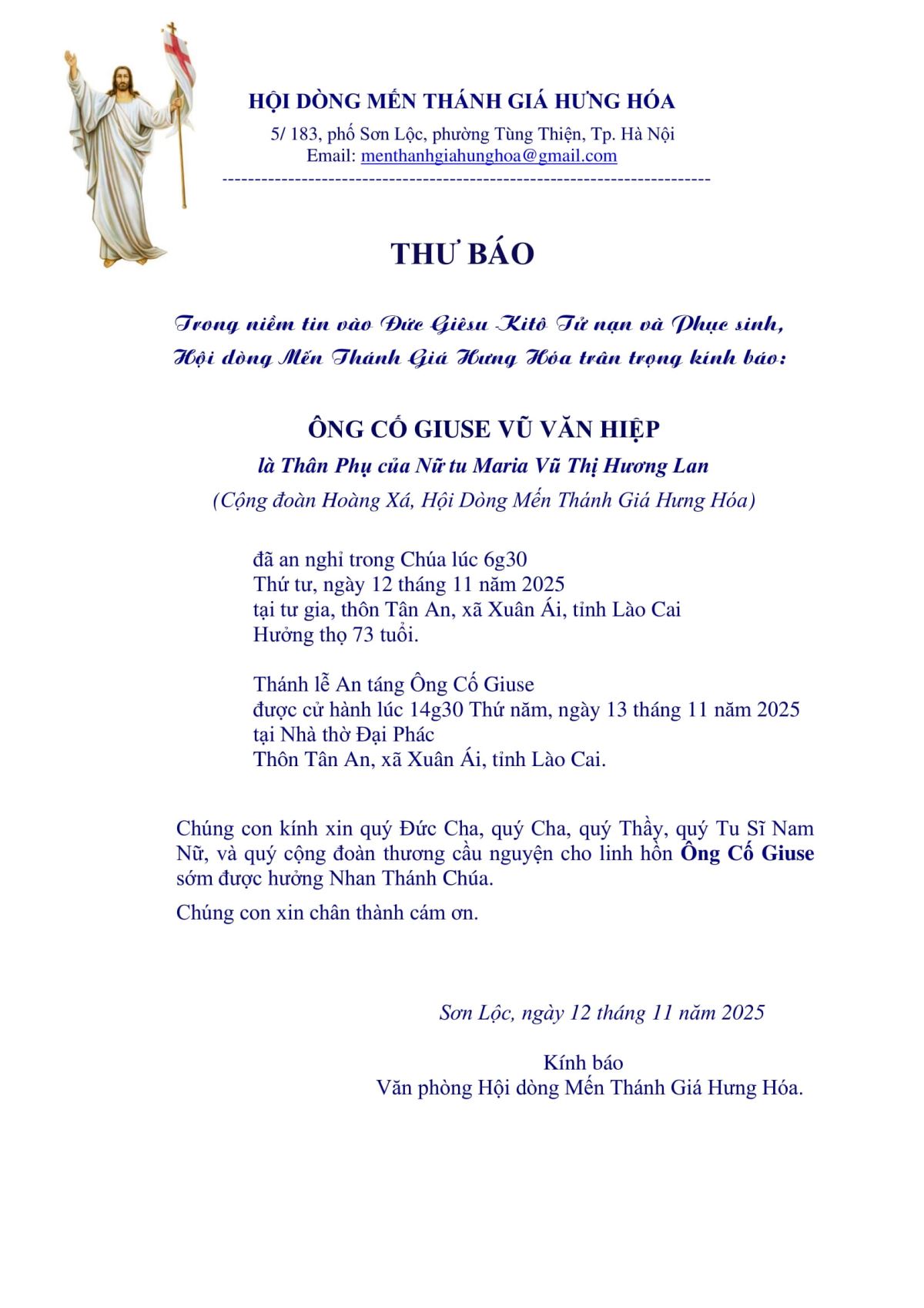 Cáo Phó: Ông cố Giuse Vũ Văn Hiệp | Thân phụ Nữ tu Maria Vũ Thị Hương Lan (Cộng đoàn Hoàng Xá) - Hội dòng Mến Thánh Giá Hưng Hóa