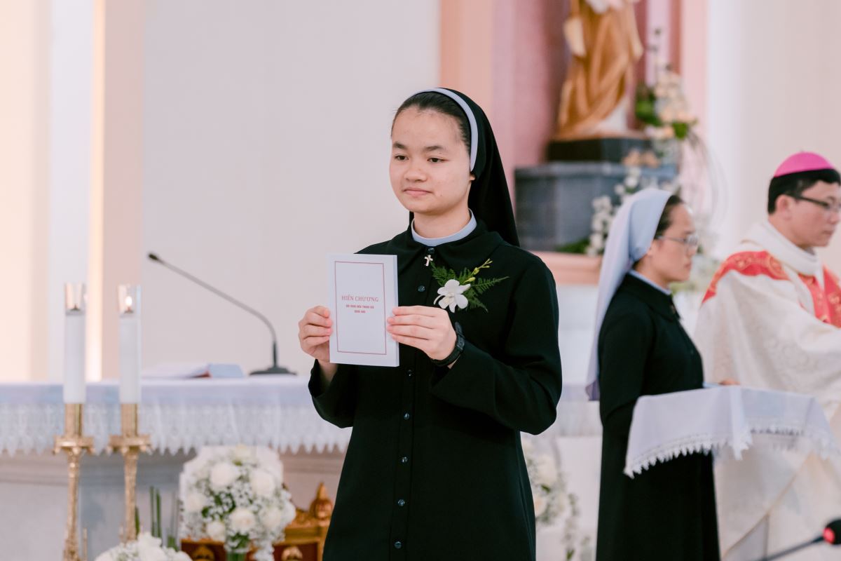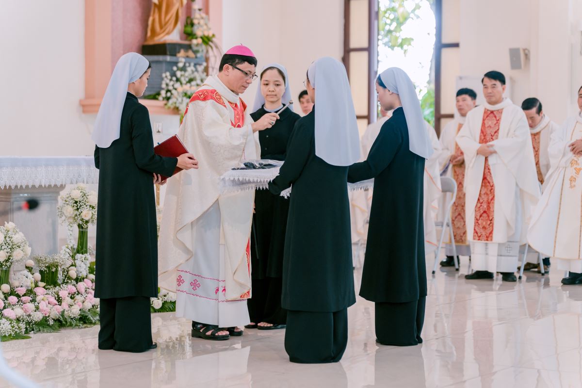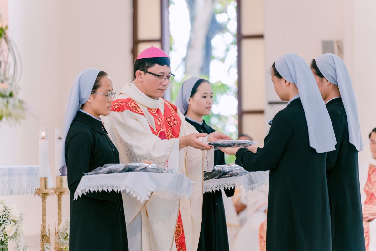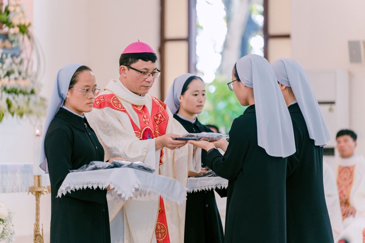 Sau đó, Đức Giám mục cũng ân cần trao Hiến chương của Hội Dòng như những bảo chứng thánh thiêng cho hành trình dấn thân trọn đời. Khăn lúp và Hiến chương không chỉ là những vật trao ban bên ngoài, nhưng chính là biểu tượng sống động của sự kết hiệp thâm sâu: sự tùng phục tuyệt đối vào Đức Kitô, khát vọng vươn tới đức ái trọn hảo, và sự tự nguyện hiến dâng đời mình để phục vụ tha nhân. Từ giây phút này, các chị chính thức bước vào một cuộc kết giao nhiệm mầu để chỉ còn sống cho Đức Kitô, với trọn vẹn tình yêu và lòng trung tín.