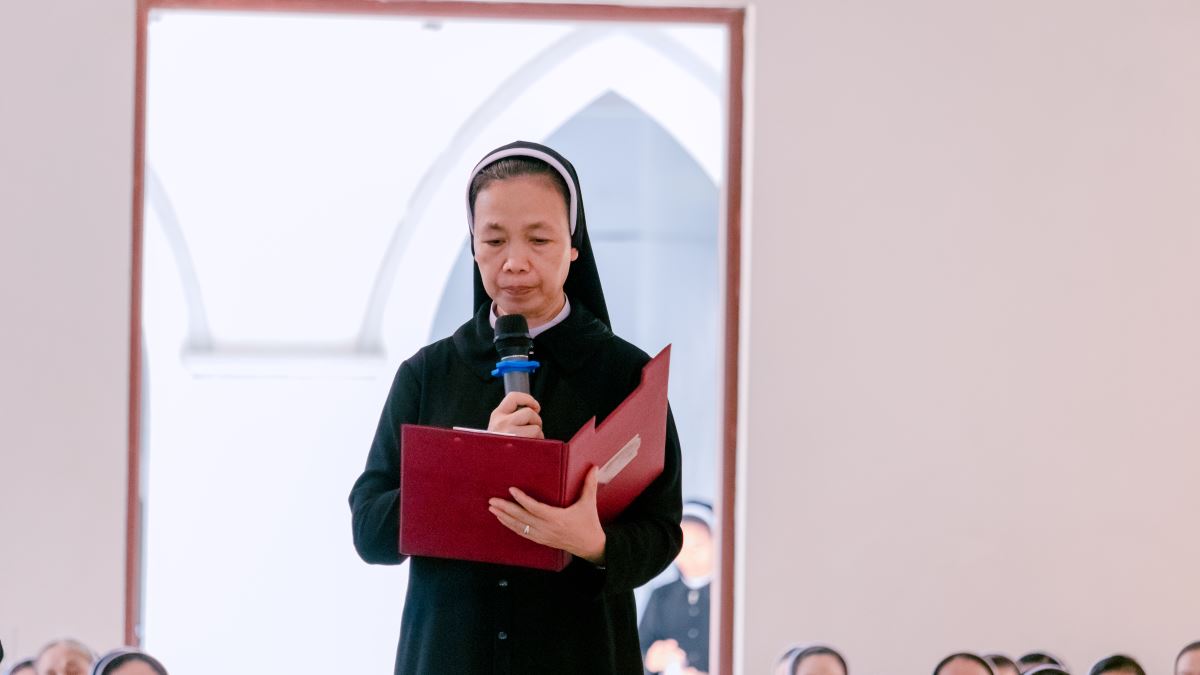 Mở đầu nghi thức tuyên khấn, Dì Giám sư Tập viện Maria Mai Thị Hà giới thiệu các ứng sinh tuyên khấn lần đầu hôm nay.