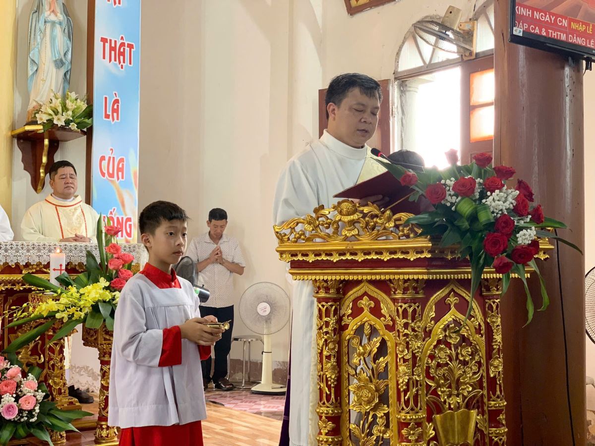 Trong bài giảng, cha Giuse Đỗ Công Tiếu – cha xứ giáo xứ Trại Cỏ, đã gợi lên cho các em tâm tình tạ ơn Thiên Chúa về hồng ân sự sống mà Thiên Chúa đã trao ban, đồng thời mời gọi các em biết noi gương Thánh Bổn mạng để sống đời chứng tá, dám giới thiệu Chúa cho bạn bè, đặc biệt là nơi môi trường học đường. Cha Giuse Đỗ Công Tiếu giảng lễ |