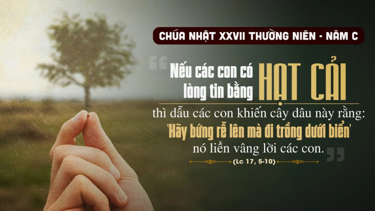 Lời Chúa hôm nay dạy chúng ta hãy tin tưởng vào Thiên Chúa. Ngôn sứ Kha-ba-cúc nói về lòng tin của những người chịu thử thách. Trong cơn khốn cùng, họ kêu đến Đức Chúa. Họ đã không nhận được lời đáp cứu. Họ luôn tin cậy và sống theo đường lối của Đức Chúa. Họ phải chứng kiến những điều tội lỗi, gian ác của con người. Vậy mà Thiên Chúa không thấy hay sao: “Trước mặt con, toàn là cảnh phá phách, bạo tàn, chỗ nào cũng thấy tranh chấp và cãi cọ.” Họ chịu biết bao cơn cám dỗ từ những người gian ác. Những người đó vẫn vô sự. Trước những lời kêu cầu của người công chính, Đức Chúa mời gọi họ hãy kiên trì chờ đợi. Vào thời ấn định, Đức Chúa sẽ giải thoát họ khỏi thử thách gian nan, chứ không trì hoãn. Trong ngày đó, người gian ác sẽ gục ngã. Còn người công chính sẽ được sống, nhờ lòng thành tín của họ. (x.Kb 1,2-3;2,2-4). Đến thời đến buổi, Thiên Chúa sai Ngôi Hai xuống thế làm người để củng cố lòng tin cho người công chính. Chúa Giê-su đến mời gọi con người sống đúng với cội nguồn Lề Luật. Người kiện toàn Lề Luật. Điều này làm các Tông Đồ thay đổi suy nghĩ về Đấng Mê-si-a như những người Do-thái lúc bấy giờ. Các Tông Đồ đã xin Chúa Giê-su củng cố thêm đức tin: “Thưa Thầy, xin thêm lòng tin cho chúng con.” Các ông xin Chúa Giê-su cho các ông thật sự tin vào Người, đừng để các ông phải ngã lòng trước thử thách. Chúa Giê-su nói với các Tông Đồ: “Nếu anh em có lòng tin lớn bằng hạt cải, thì dù anh em có bảo cây dâu này: ‘Hãy bật rễ lên, xuống dưới biển kia mà mọc’, nó cũng sẽ vâng lời anh em.” Người mời gọi các ông chỉ cần tin thôi, thì các ông làm việc gì cũng được. Trong mọi việc, các ông đặt trọn trong sự quan phòng của Thiên Chúa, khiêm tốn nhìn nhận mọi việc đều bởi ơn Chúa ban. Như thế, các Tông Đồ mới thực sự tin cậy vào Thiên Chúa.