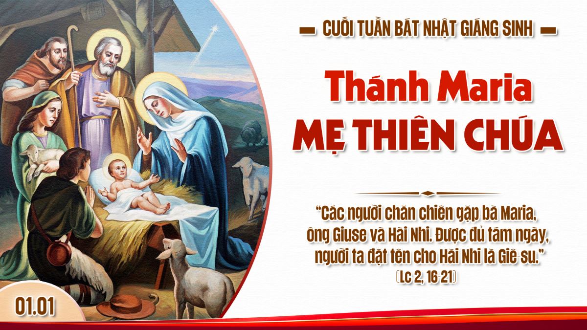 Câu Tung Hô Tin Mừng, mà các nhà phụng vụ đã chọn cho ngày lễ hôm nay là: Thuở xưa, nhiều lần nhiều cách, Thiên Chúa đã phán dạy cha ông chúng ta qua các ngôn sứ; nhưng vào thời sau hết này, Thiên Chúa đã phán dạy chúng ta qua Thánh Tử. Trong bài Tin Mừng, thánh Luca tường thuật lại: Các người chăn chiên gặp bà Maria, ông Giuse và Hài Nhi. Được đủ tám ngày, người ta đặt tên cho Hài Nhi là Giêsu. Hài Nhi Giêsu là Đấng cứu độ trần gian: hôm qua cũng như hôm nay, và như vậy mãi đến muôn đời. Nhờ Thánh Tử chí ái, ta được nhận làm nghĩa tử. Nhờ Đức Maria, Đức Giêsu đã nên giống anh em mình về mọi phương diện, để trở thành một vị Thượng Tế nhân từ và trung tín trong việc thờ phượng Thiên Chúa, hầu đền tội thay cho tất cả mọi người. Đức Maria là người có phúc nhất trong giới phụ nữ, bởi vì, Đấng trời cùng đất không chứa nổi, thì, chính Mẹ đã được phúc cưu mang. Nhờ hiệp thông và hợp nhất với Ngôi Lời, thân xác loài người đạt được mức thăng tiến phi thường: từ thân phận phải chết, thân xác trở thành bất tử; từ giới sinh vật có sinh khí, thân xác trở nên loài có thần khí; được làm ra bởi đất, thân xác được vào cửa trời. Ngày Đức Trinh Nữ Maria sinh hạ Đấng Cứu Thế, Chúa đã tặng ban cho nhân loại kho tàng ơn cứu độ muôn đời. Ước gì chúng ta đáng nhận lãnh nguồn sức sống vĩnh cửu là Đức Giêsu Kitô. Ước gì được như thế!