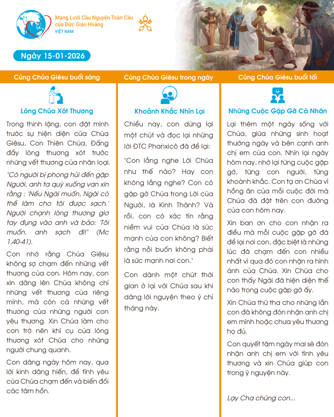 Lòng Chúa Xót Thương Trong thinh lặng, con đặt mình trước sự hiện diện của Chúa Giêsu, Con Thiên Chúa, Đấng đầy lòng thương xót trước những vết thương của nhân loại. “Có người bị phong hủi đến gặp Người, anh ta quỳ xuống van xin rằng: 'Nếu Ngài muốn, Ngài có thể làm cho tôi được sạch.' Người chạnh lòng thương giơ tay đụng vào anh và bảo: 'Tôi muốn, anh sạch đi!” (Mc 1,40-41). Con nhớ rằng Chúa Giêsu không sợ chạm đến những vết thương của con. Hôm nay, con xin dâng lên Chúa không chỉ những vết thương của riêng mình, mà còn cả những vết thương của những người con yêu thương. Xin Chúa làm cho con trở nên khí cụ của lòng thương xót Chúa cho những người chung quanh. Con dâng ngày hôm nay, qua lời kinh dâng hiến, để tình yêu của Chúa chạm đến và biến đổi các tâm hồn.