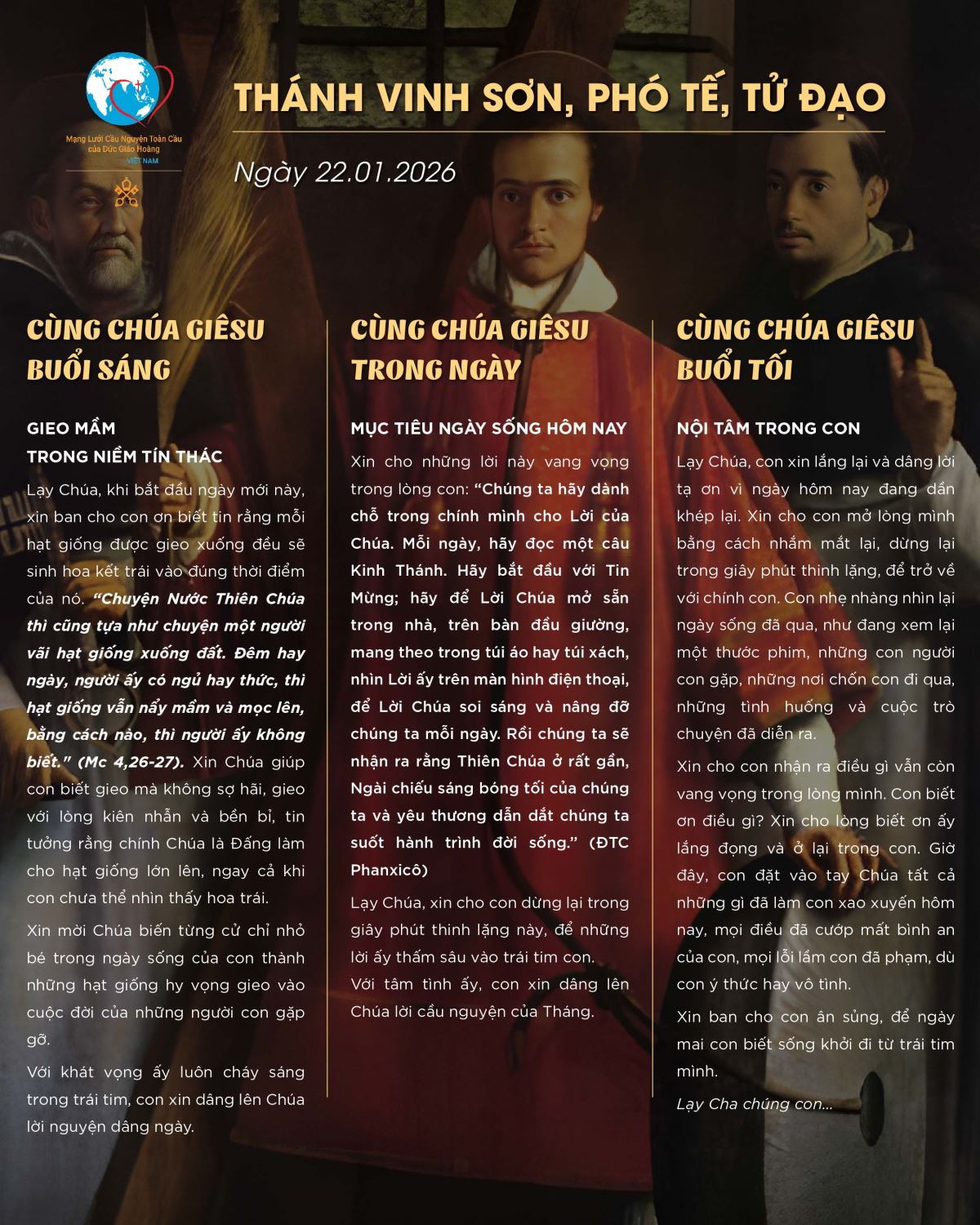 Mục tiêu ngày sống hôm nay Xin cho những lời này vang vọng trong lòng con: “Chúng ta hãy dành chỗ trong chính mình cho Lời của Chúa. Mỗi ngày, hãy đọc một câu Kinh Thánh. Hãy bắt đầu với Tin Mừng; hãy để Lời Chúa mở sẵn trong nhà, trên bàn đầu giường, mang theo trong túi áo hay túi xách, nhìn Lời ấy trên màn hình điện thoại, để Lời Chúa soi sáng và nâng đỡ chúng ta mỗi ngày. Rồi chúng ta sẽ nhận ra rằng Thiên Chúa ở rất gần, Ngài chiếu sáng bóng tối của chúng ta và yêu thương dẫn dắt chúng ta suốt hành trình đời sống.” (ĐTC Phanxicô) Lạy Chúa, xin cho con dừng lại trong giây phút thinh lặng này, để những lời ấy thấm sâu vào trái tim con. Với tâm tình ấy, con xin dâng lên Chúa lời cầu nguyện của Tháng.