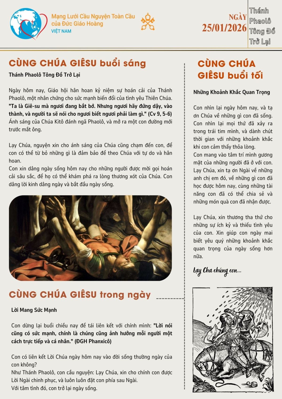 Thánh Phaolô Tông Đồ Trở Lại Ngày hôm nay, Giáo hội hân hoan kỷ niệm sự hoán cải của Thánh Phaolô, một nhân chứng cho sức mạnh biến đổi của tình yêu Thiên Chúa. "Ta là Giê-su mà ngươi đang bắt bớ. Nhưng ngươi hãy đứng dậy, vào thành, và người ta sẽ nói cho ngươi biết ngươi phải làm gì." (Cv 9, 5-6) Ánh sáng của Chúa Kitô đánh ngã Phaolô, và mở ra một con đường mới trước mắt ông. Lạy Chúa, nguyện xin cho ánh sáng của Chúa cũng chạm đến con, để con có thể từ bỏ những gì là đảm bảo để theo Chúa với tự do và hân hoan. Con xin dâng ngày sống hôm nay cho những người được mời gọi hoán cải sâu sắc, để họ có thể khám phá ra lòng thương xót của Chúa. Con dâng lời kinh dâng ngày và bắt đầu ngày sống.