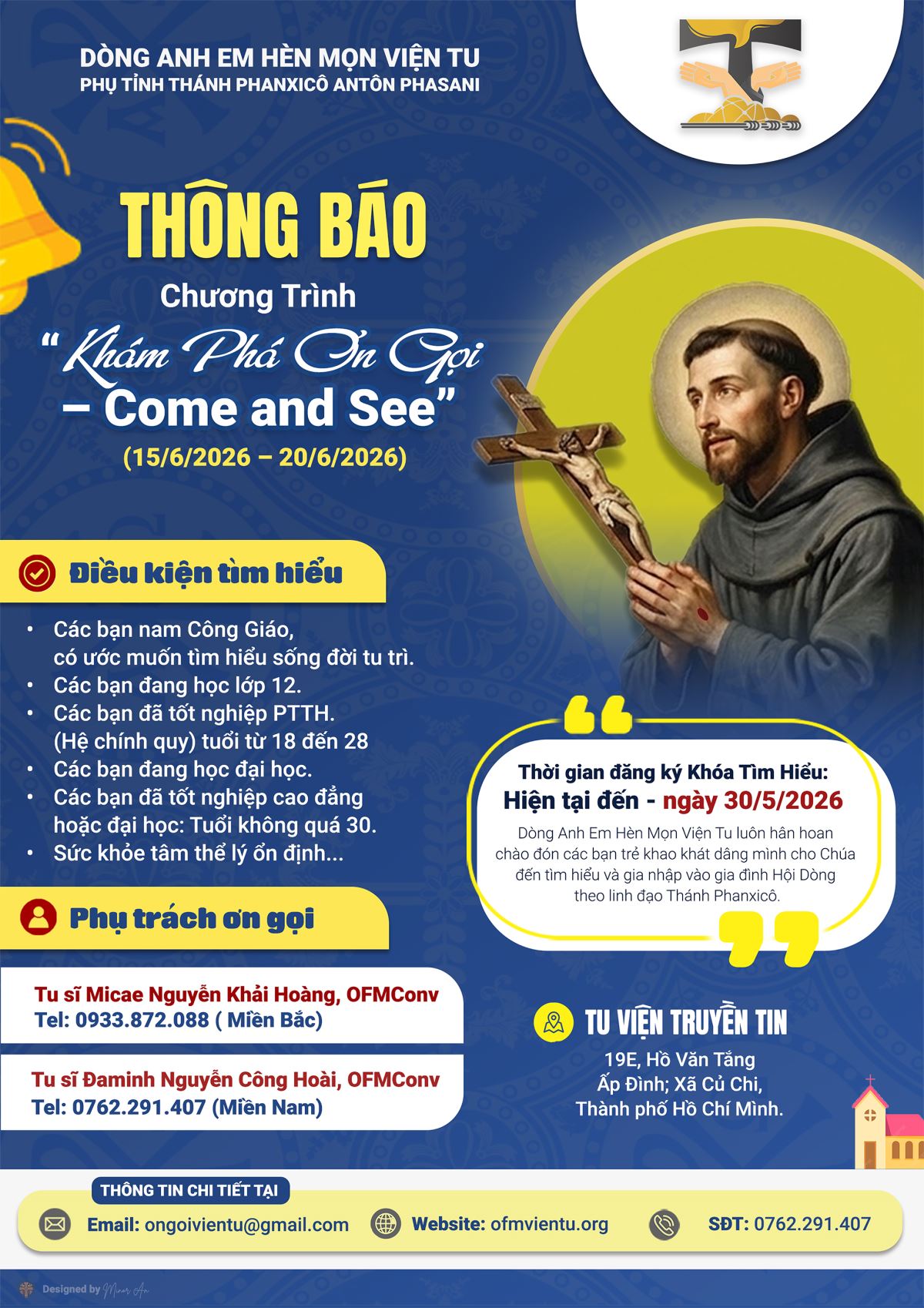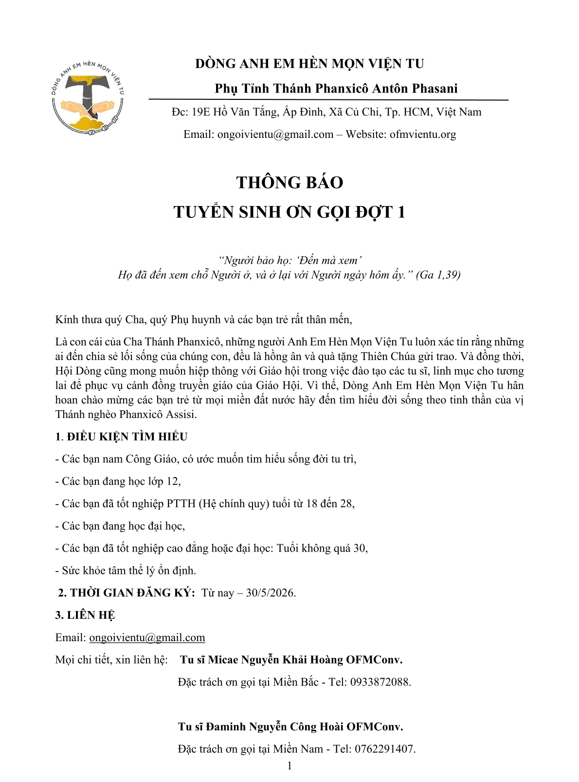 Dòng Anh Em Hèn Mọn Viện Tu Thông Báo Tuyển Sinh Ơn Gọi Đợt 1