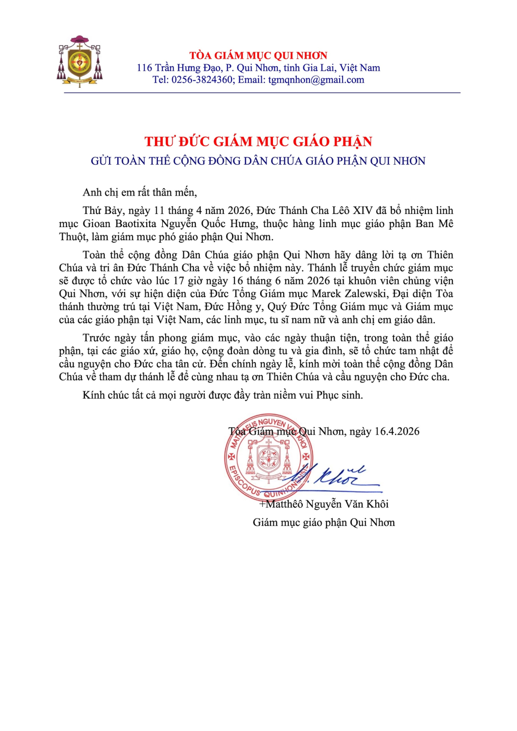 Tòa Giám mục Qui Nhơn: Thông báo về Thánh lễ Truyền chức Giám mục phó