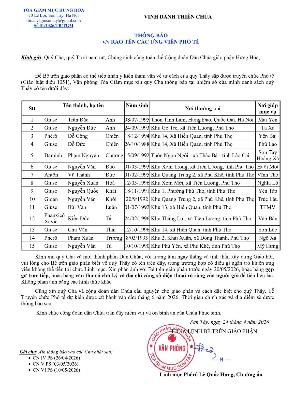 Để bề trên giáo phận có thể tiếp nhận ý kiến tham vấn về tư cách của quý Thầy sắp được truyền chức Phó tế (Giáo luật 1051), Văn phòng Toà Giám mục xin quý Cha thông báo trong nhiệm sở của mình danh sách các Thầy có tên sau đây