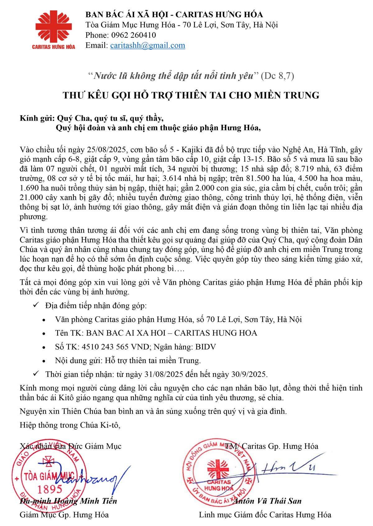 Mọi sự đóng góp, xin gửi về tài khoản của Uỷ Ban Caritas giáo phận theo số tài khoản: