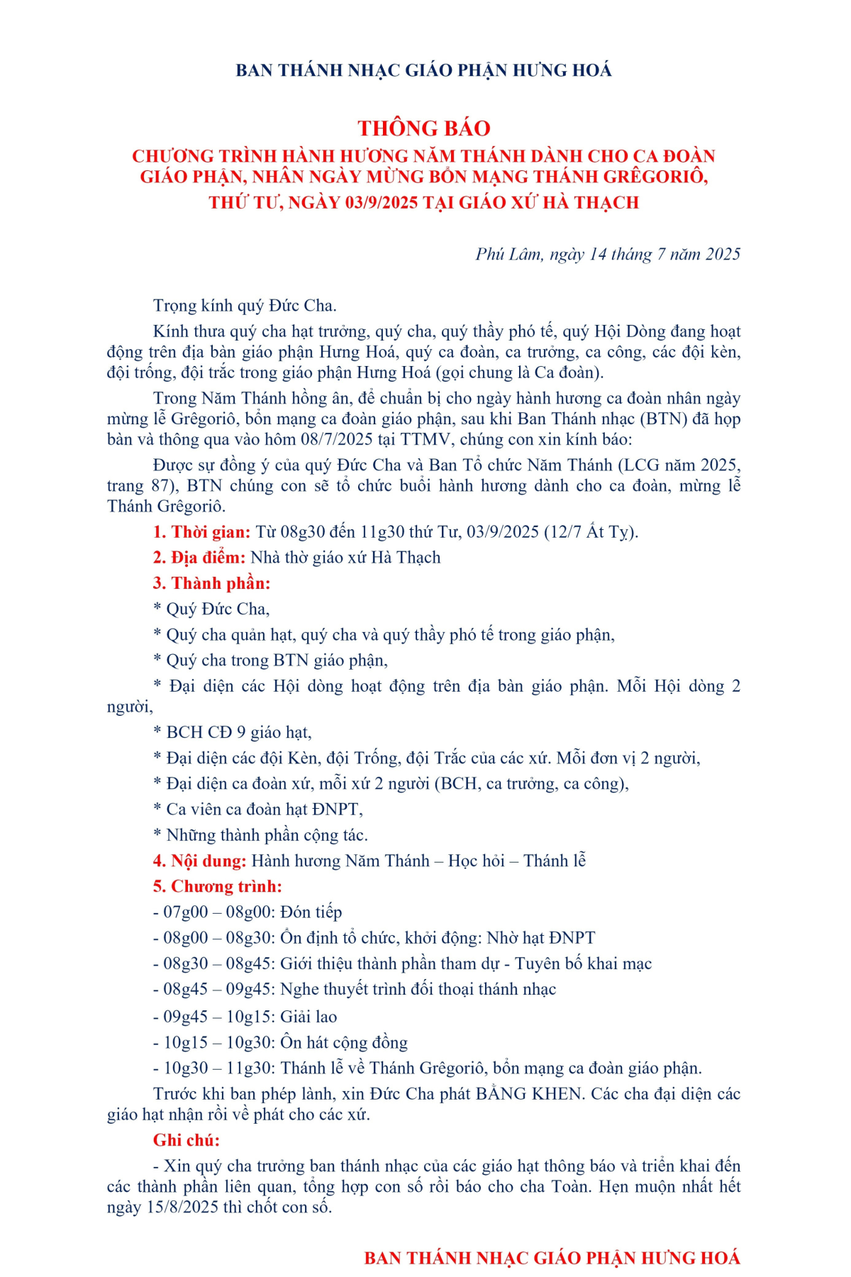 Ủy Ban Thánh Nhạc: Thông báo chương trình Hành Hương Năm Thánh dành cho Ca đoàn Giáo phận