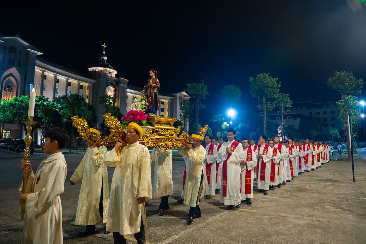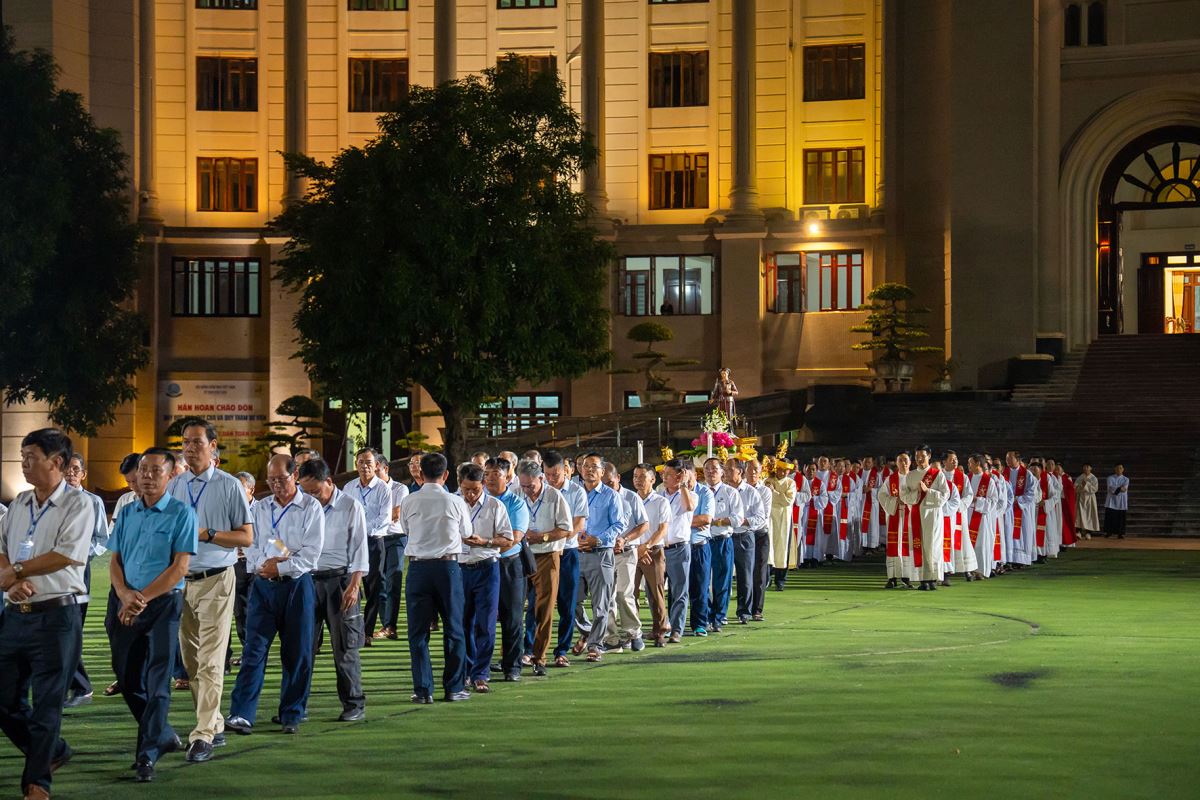 Vào lúc 19h00, các tham dự viên sốt sắng cung nghinh tượng Thánh nữ Anê Lê Thị Thành - Quan thầy UBGD toàn quốc - chứng nhân đức tin anh dũng. Hình ảnh đoàn rước trang nghiêm tôn vinh Thánh Quan thầy tiến vào nhà thờ, làm bừng sáng niềm tin, gợi nhắc hành trình kiên trung sống đạo của bao thế hệ tín hữu Việt Nam.
