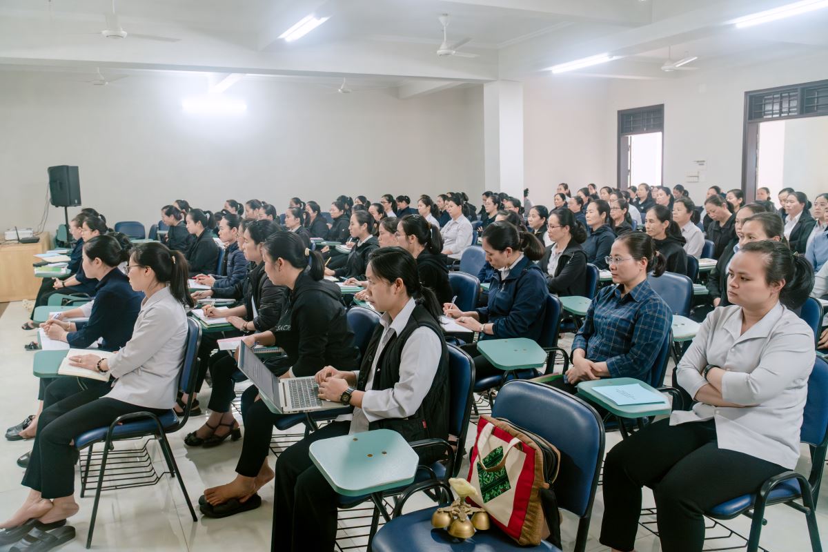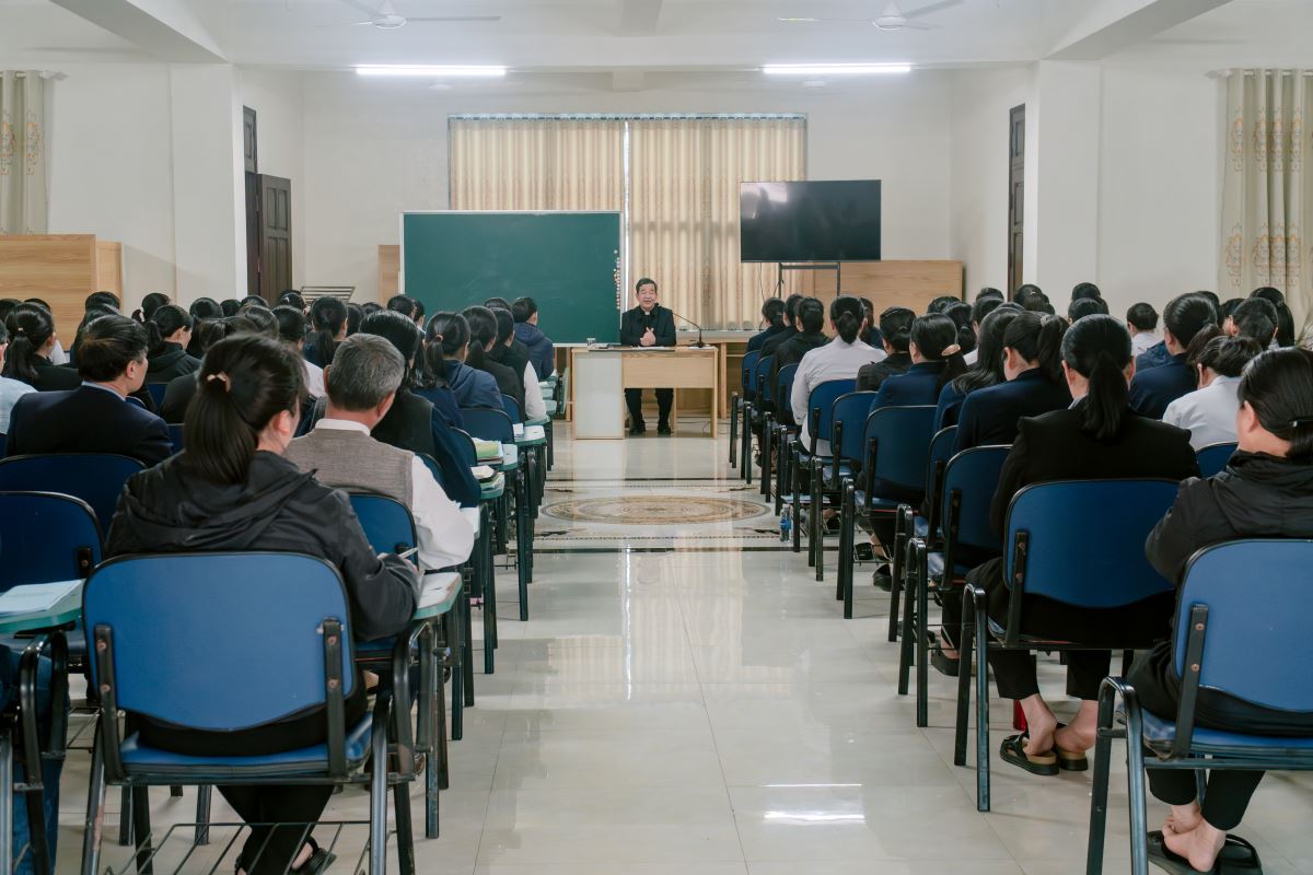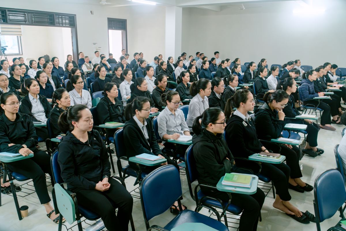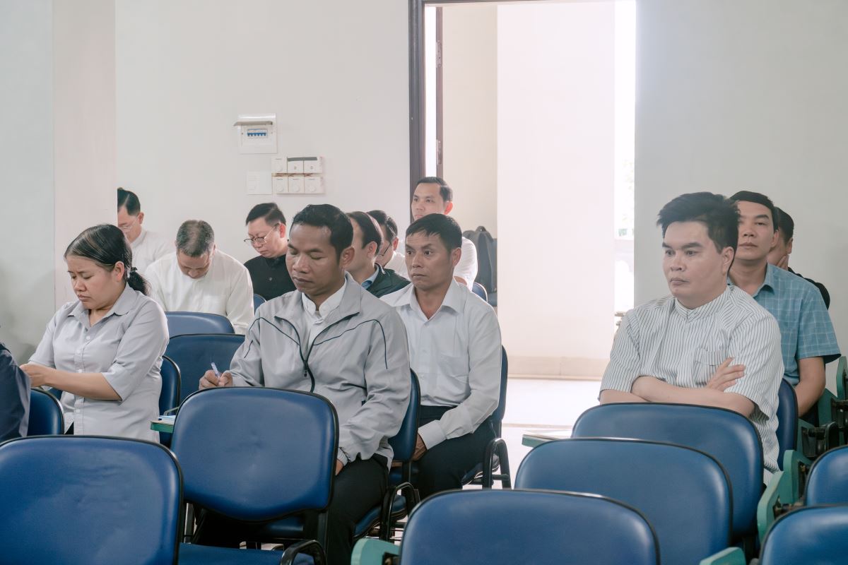 Trong giờ huấn đức lúc 14g30, Đức cha Đaminh mời gọi các tác viên Tin Mừng ý thức sâu sắc hơn về sứ mạng mà Giáo hội trao phó. Ngài nhấn mạnh rằng hành trình truyền giáo đòi hỏi đời sống cầu nguyện, tinh thần khiêm tốn, kiên trì và quảng đại dấn thân, để mỗi người trở nên chứng nhân sống động của Tin Mừng giữa bà con nơi các bản làng vùng cao. Đức cha cũng mời gọi quý linh mục đang coi sóc các điểm truyền giáo tiếp tục đồng hành, nâng đỡ và quan tâm đến các tác viên, tạo điều kiện để họ được tham dự đời sống phụng vụ và cầu nguyện, nhờ đó luôn được nuôi dưỡng đời sống đức tin và thêm sức mạnh thiêng liêng trong hành trình sứ vụ. Đồng thời, ngài cũng chia sẻ cụ thể về những công việc mục vụ mà các tác viên Tin Mừng sẽ đảm nhận tại nơi mình được sai đến.