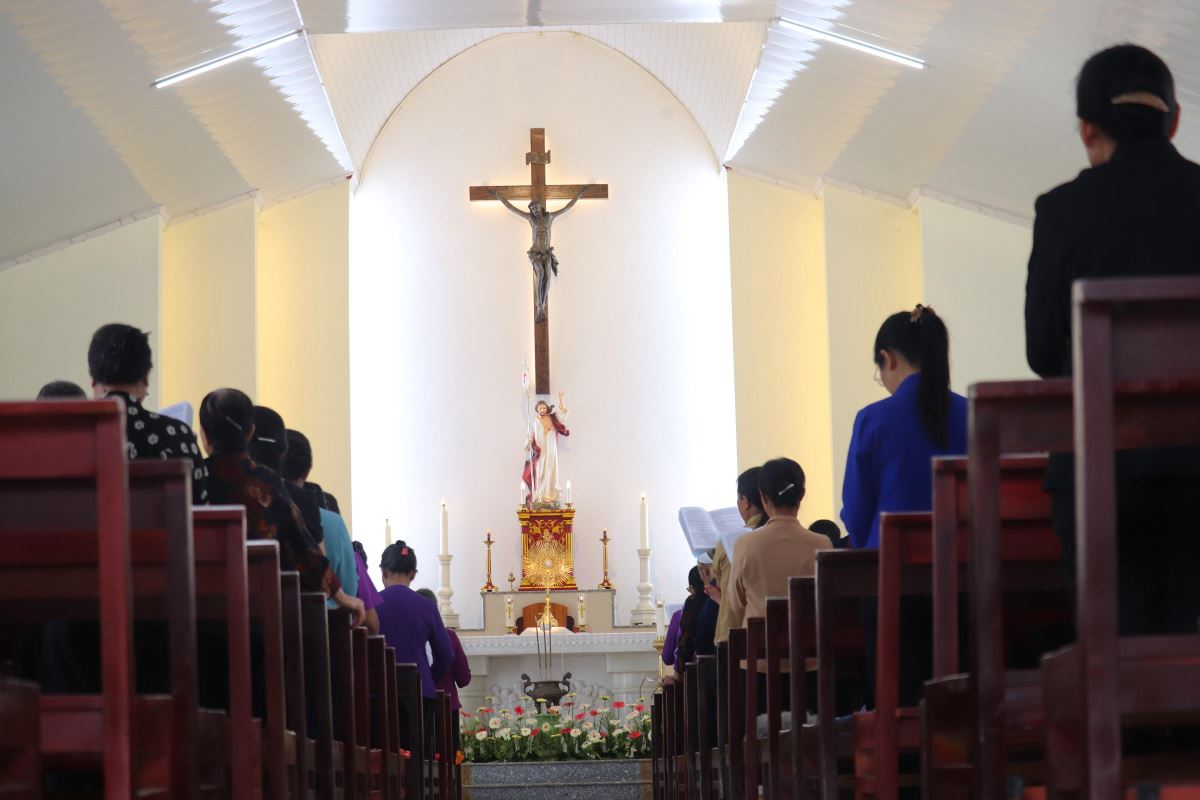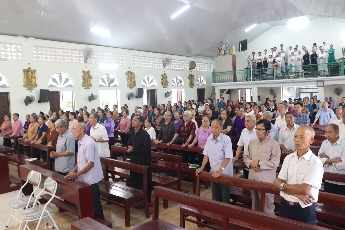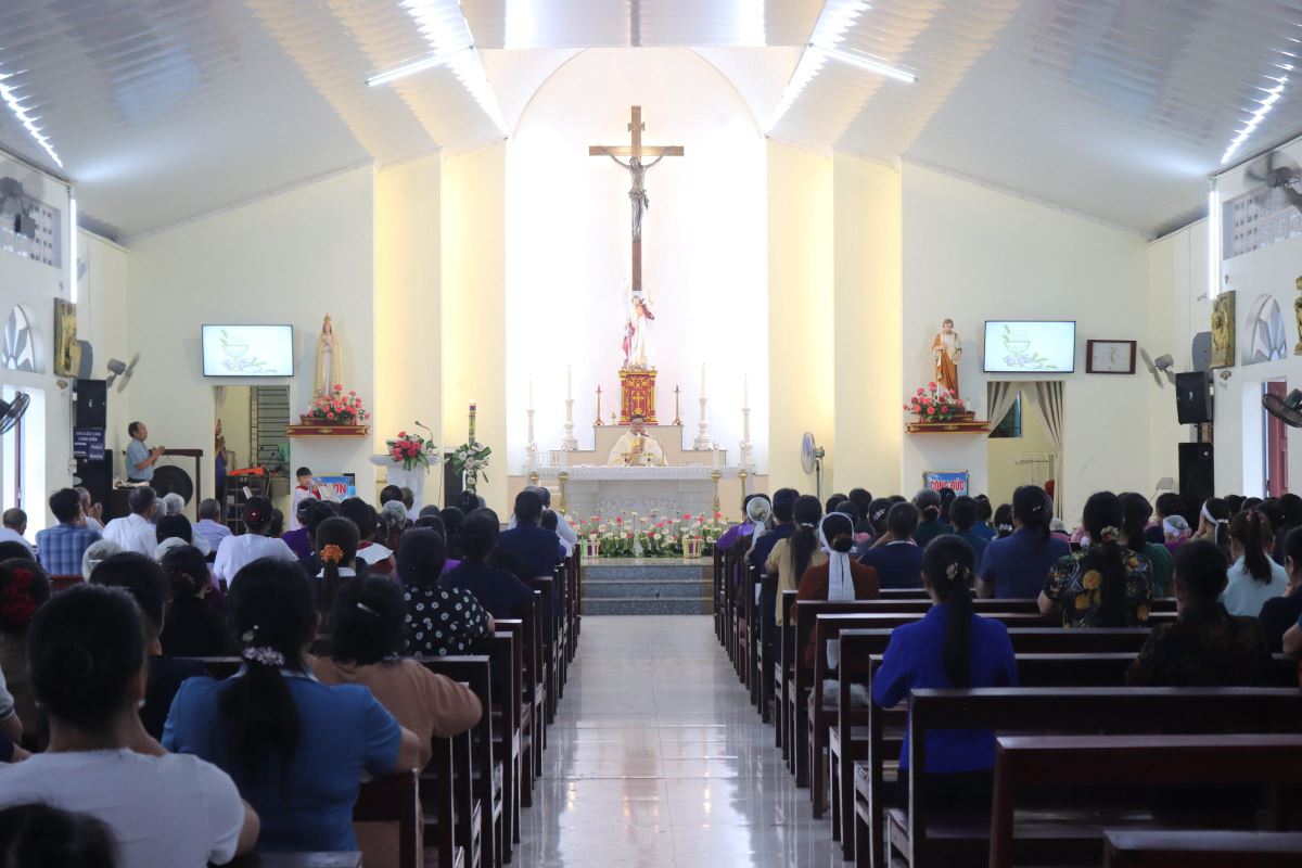 Sau giờ chầu chung, cha quản xứ Antôn Vũ Thái San dâng Thánh lễ Chúa Nhật IV Phục Sinh, ngày cầu nguyện cho ơn gọi thiên triệu. Hiện diện trong Thánh lễ có quý Dì cộng đoàn Mến Thánh Giá Hoàng Xá cùng đông đảo thành phân dân Chúa trong và ngoài chuẩn xứ.