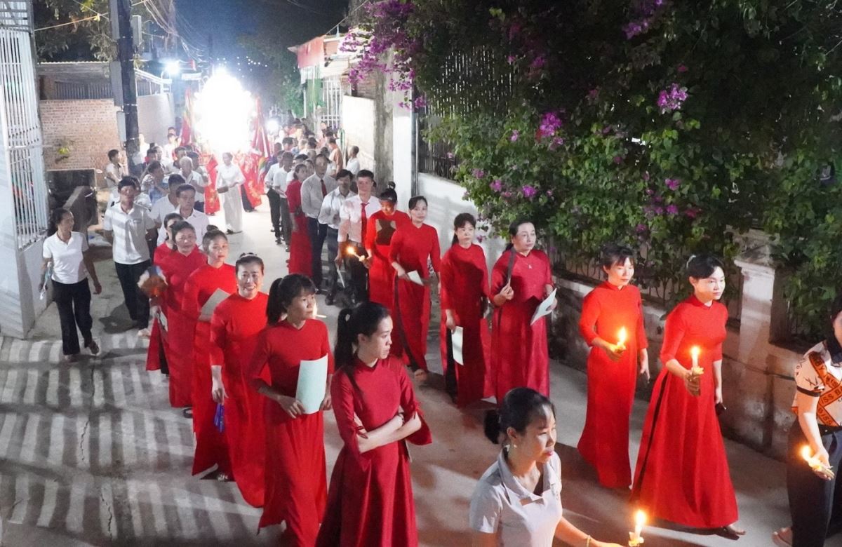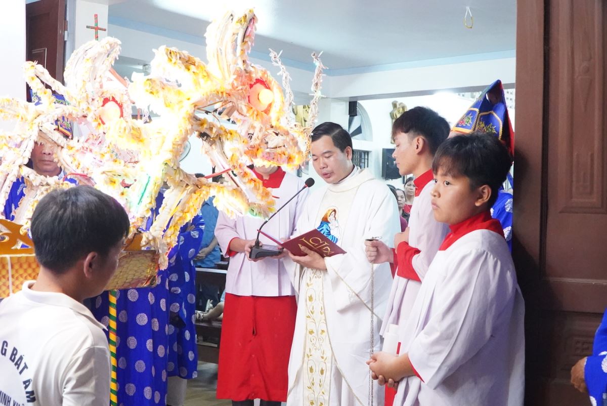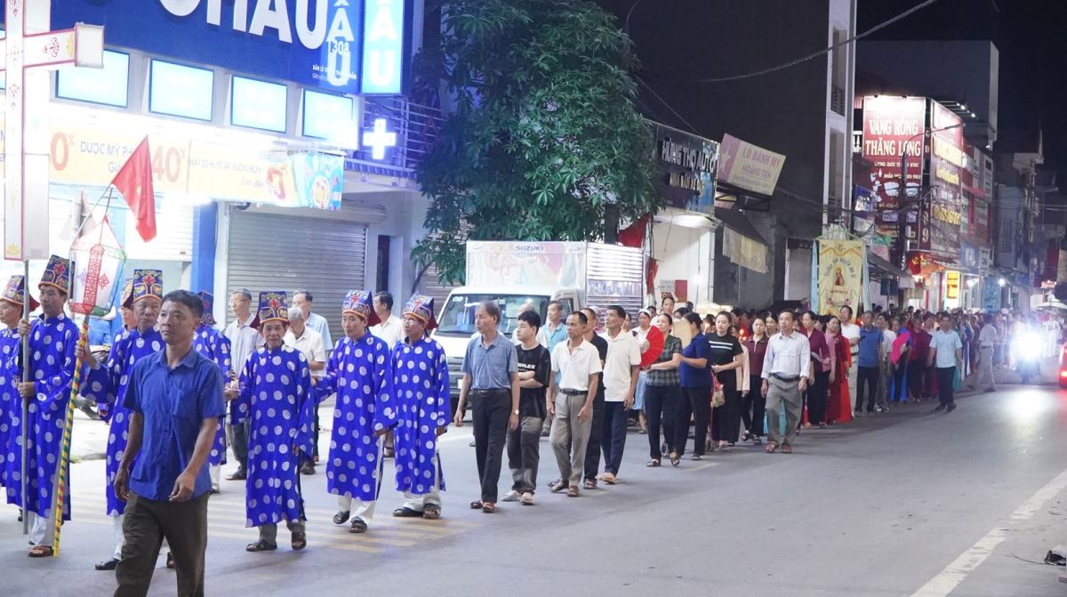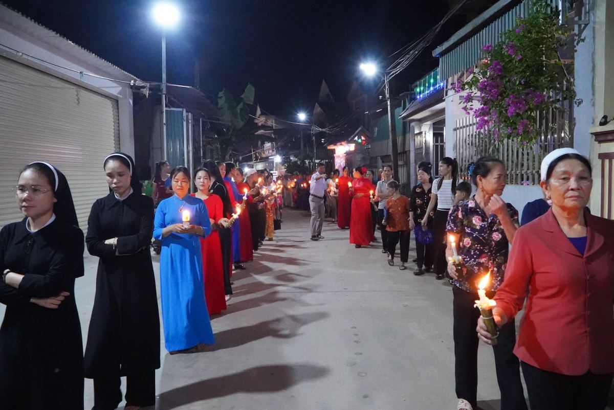 Vào lúc 19g15, thứ Ba, ngày 13.5.2025 các hội đoàn và mọi thành phần dân Chúa tập trung trước kiệu Đức Mẹ để chuẩn bị cho cuộc rước. Trước tiên, cộng đoàn sốt sắng nguyện kinh xin ơn Chúa Thánh Thần, tiếp đến cuộc cung nghinh kiệu Đức Mẹ được khởi hành từ Xóm Bến, qua nhiều ngõ xóm rồi ra đường lớn đi về nhà thờ chuẩn xứ.