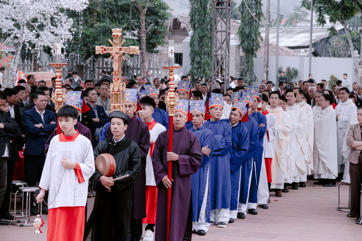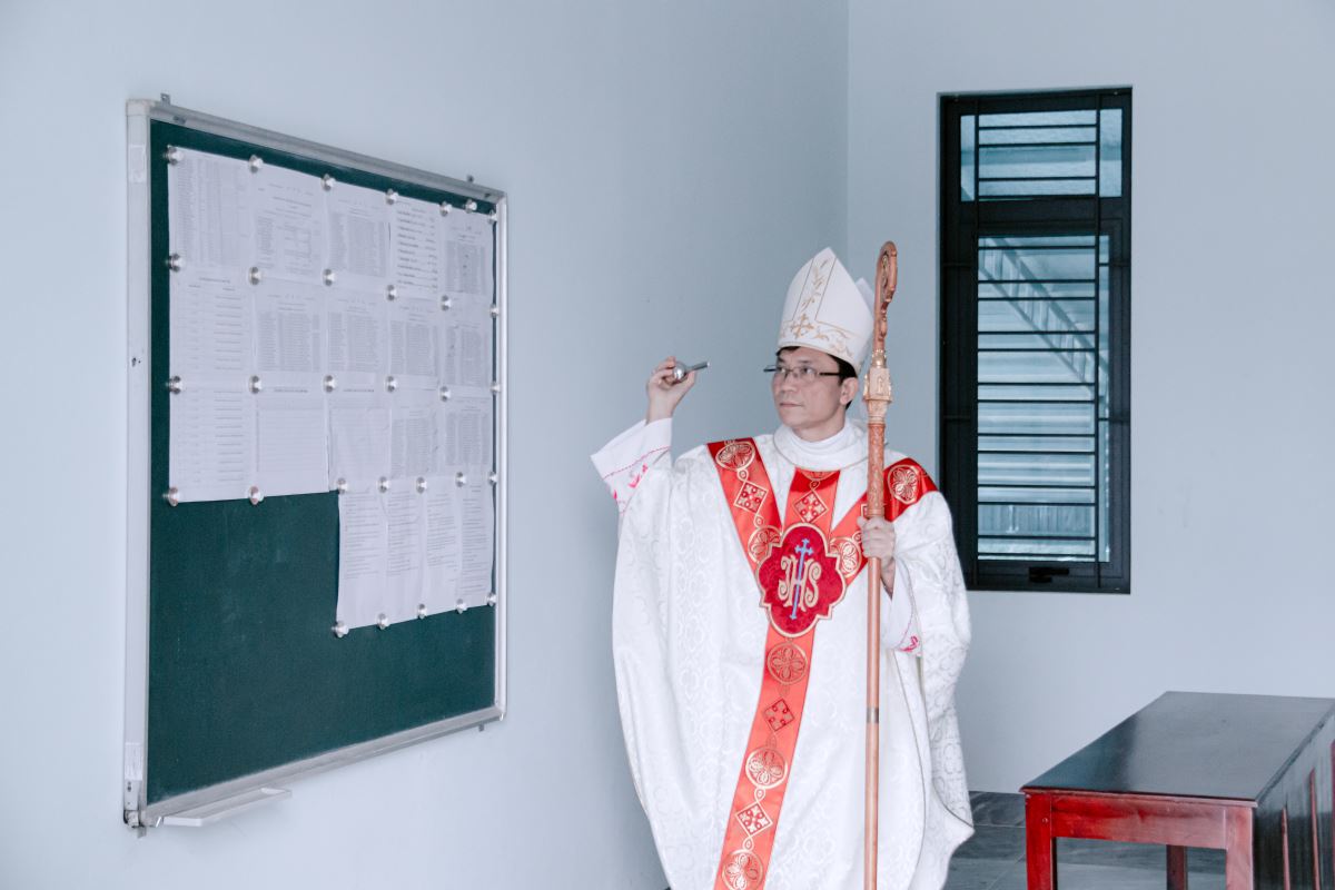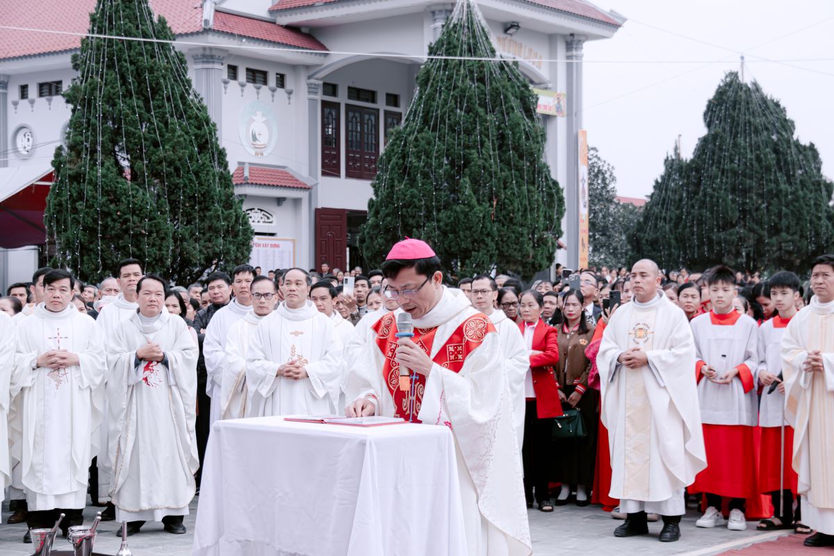 Ngay sau nghi thức cắt băng, Đức cha Phaolô Nguyễn Quang Đĩnh đã chủ sự nghi thức làm phép Nhà Giáo lý, rảy nước thánh trên công trình và dâng lời cầu nguyện xin Thiên Chúa thánh hóa nơi đây. Trong lời huấn từ, Đức cha nhấn mạnh: “Nhà Giáo lý này sẽ là môi trường ươm mầm đức tin, giúp các em thiếu nhi và người trẻ được học hỏi Lời Chúa, từng bước trưởng thành trong đời sống Kitô hữu.”