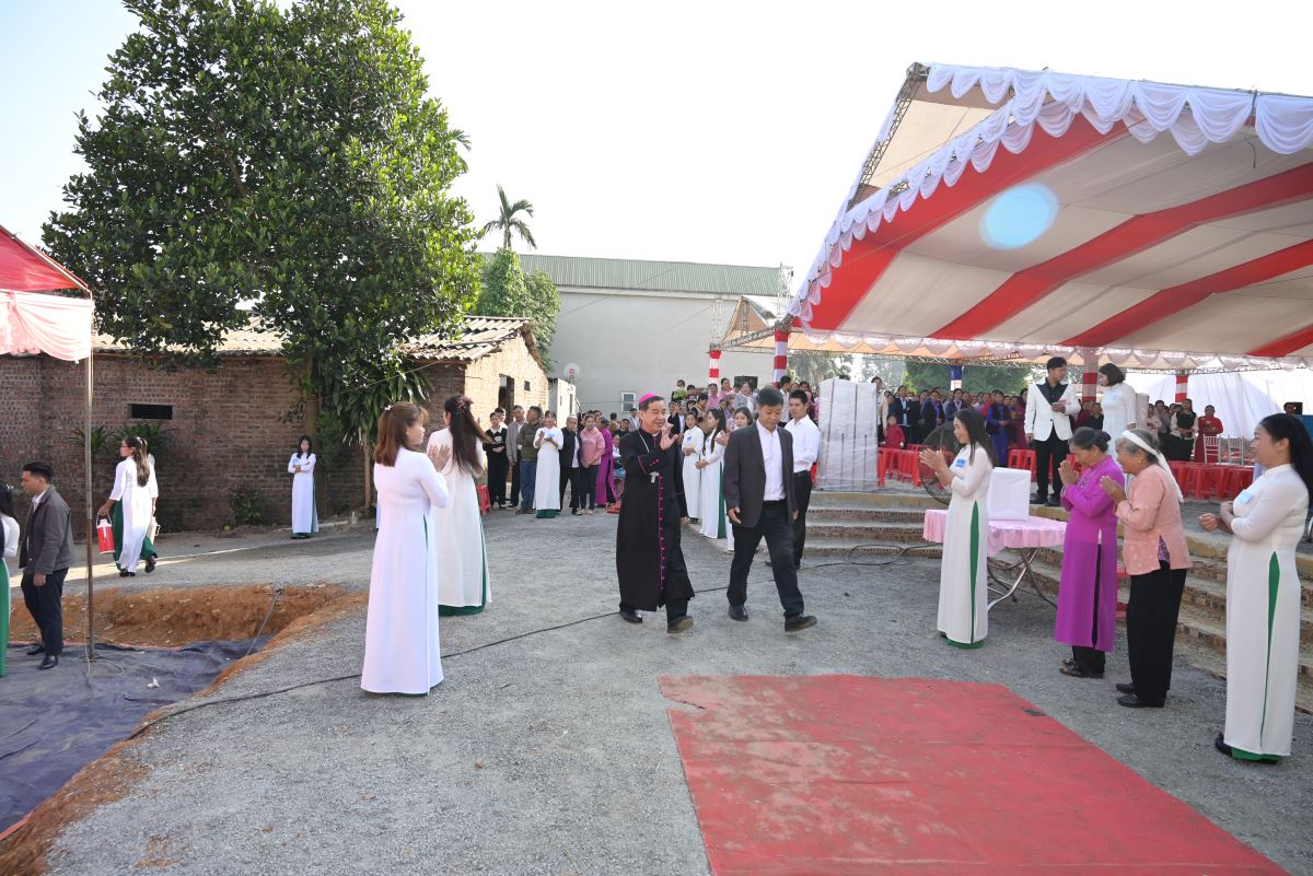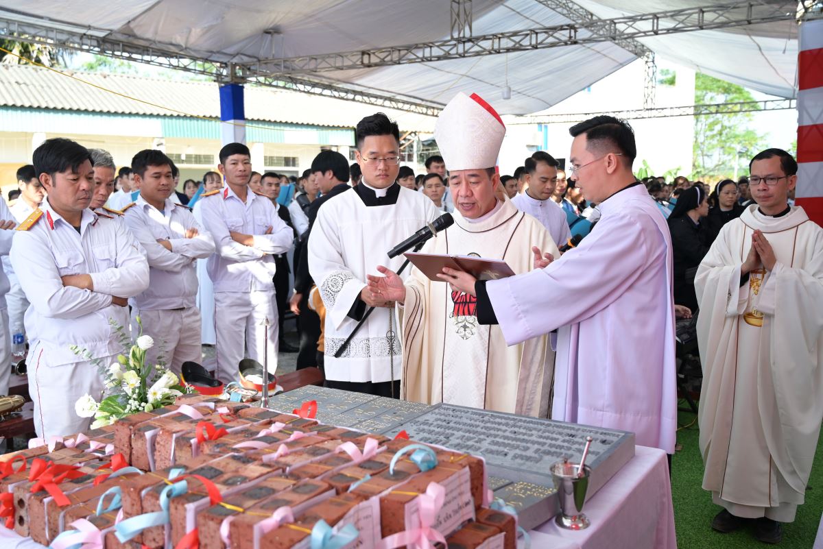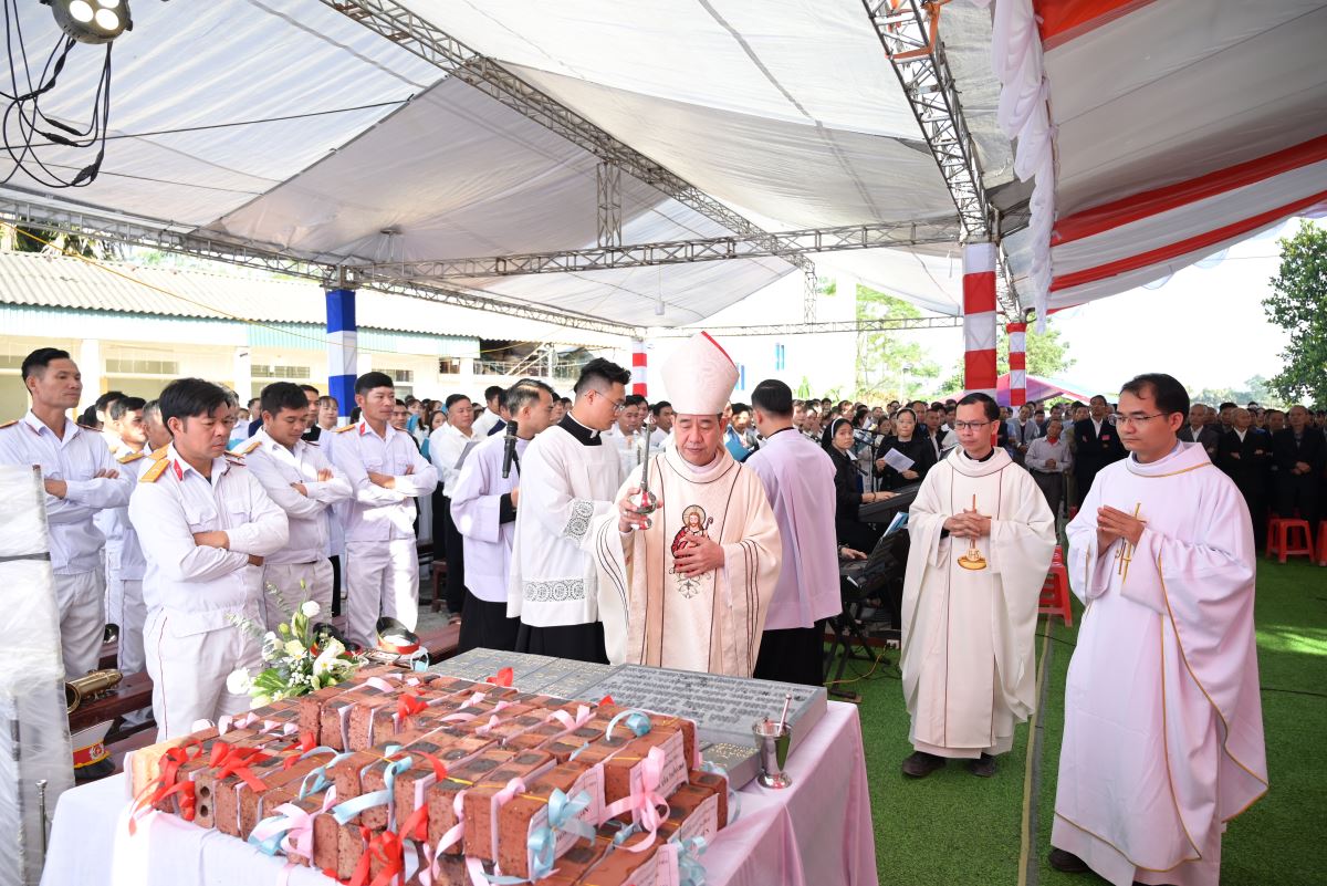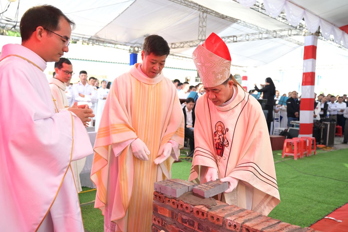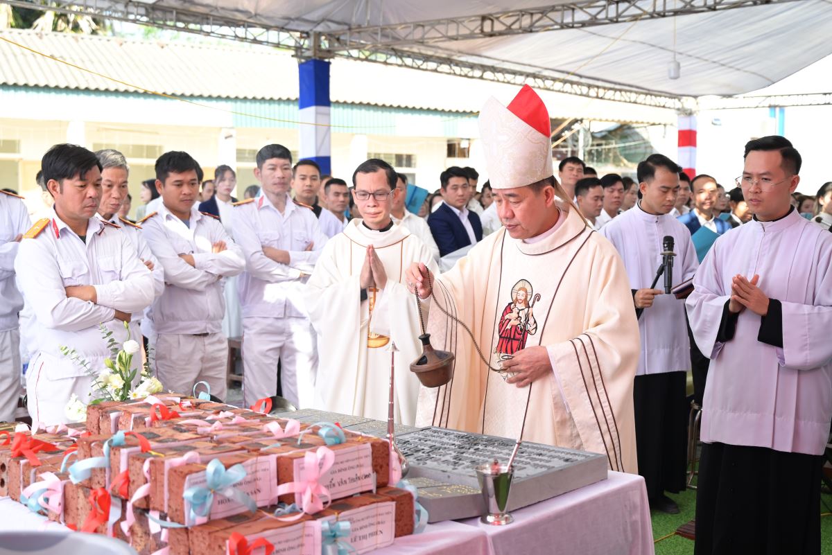 Trong bầu khí linh thiêng, Đức Cha long trọng làm phép viên đá, xông hương và đặt trên góc tường ngôi nhà thờ trong tương lai. Viên đá ấy trở thành dấu chỉ khởi đầu cho một công trình mới, đồng thời là biểu tượng sống động của chính Đức Kitô là Đá tảng góc tường, nền móng vững chắc của Hội Thánh. Toàn thể cộng đoàn thinh lặng cầu nguyện, dâng lên Chúa lời tạ ơn.