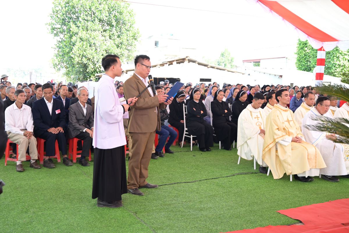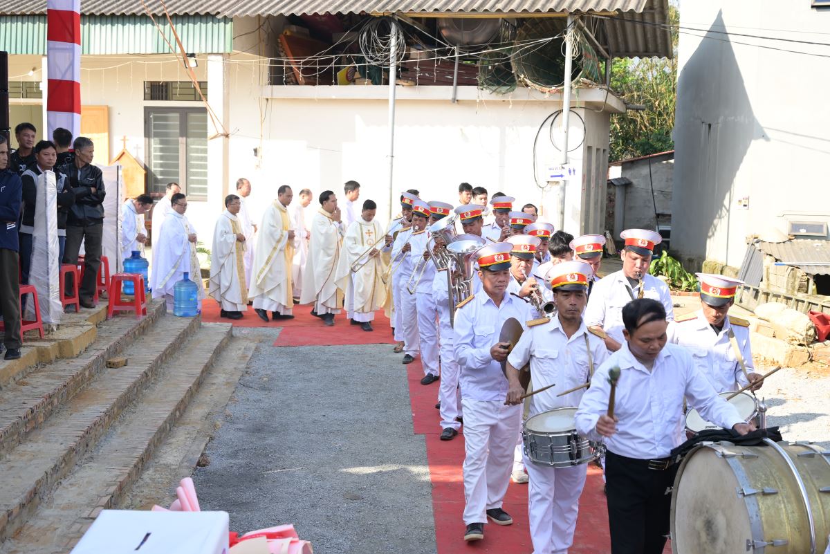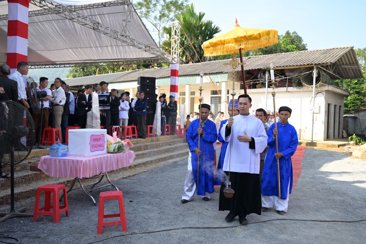 Đúng 09g00, đoàn đồng tế trang nghiêm tiến về lễ đài. Sau lời chào và lời chúc bình an của Đức Cha là phần cử hành nghi thức làm phép khu đất sẽ xây dựng ngôi thánh đường mới và làm phép viên đá góc.