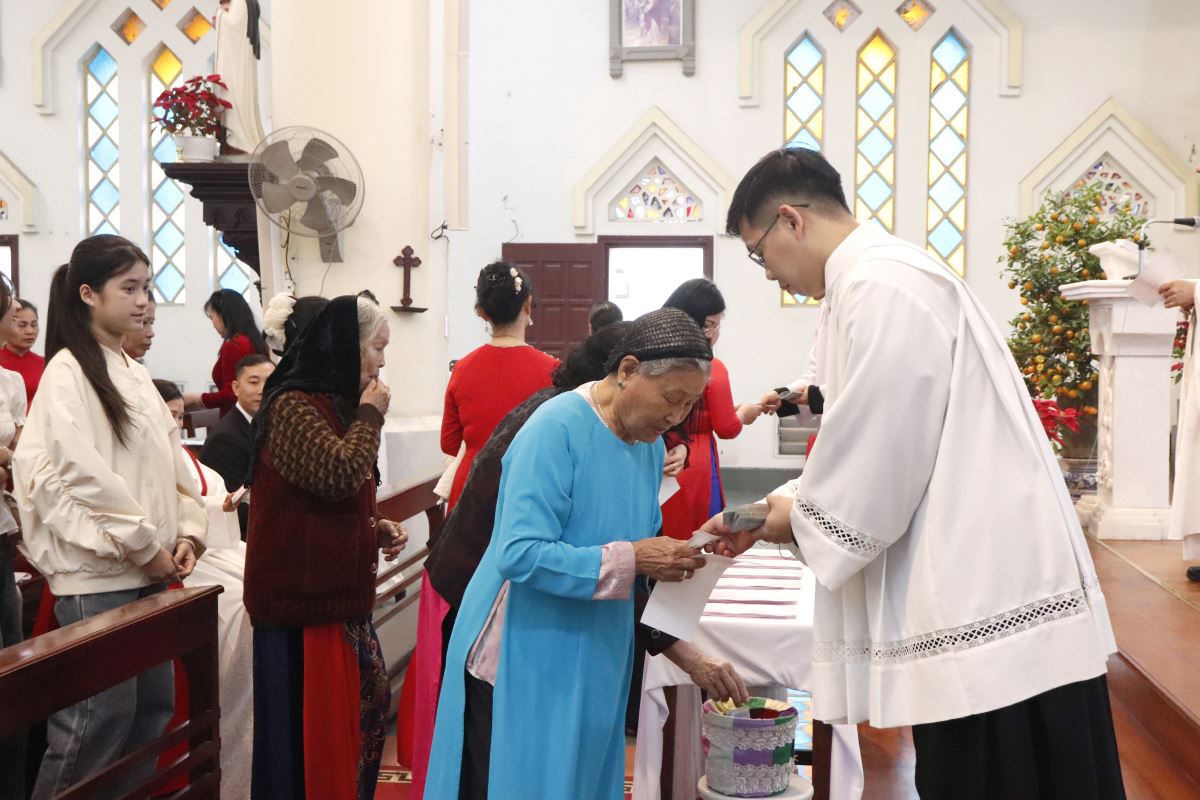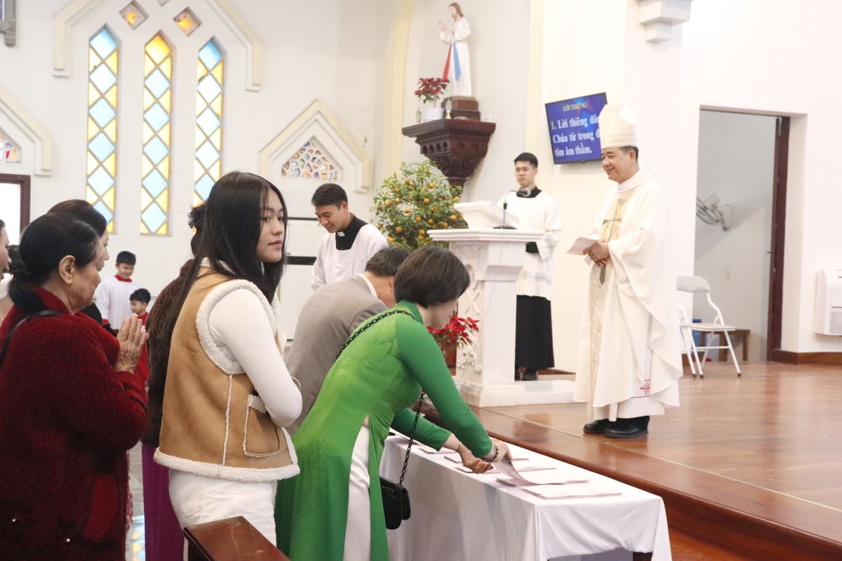 Kết thúc Thánh lễ, cộng đoàn lãnh nhận lộc thánh đầu Xuân, để Lời Chúa soi sáng và hướng dẫn trong hành trình sống đức tin suốt năm mới. Đức cha cũng trao tới cộng đoàn lì xì chúc Xuân như dấu chỉ chúc lành và tình yêu mục tử, góp phần làm nên bầu khí vui tươi, ấm áp, thắm đượm tình hiệp thông trong ngày đầu năm.