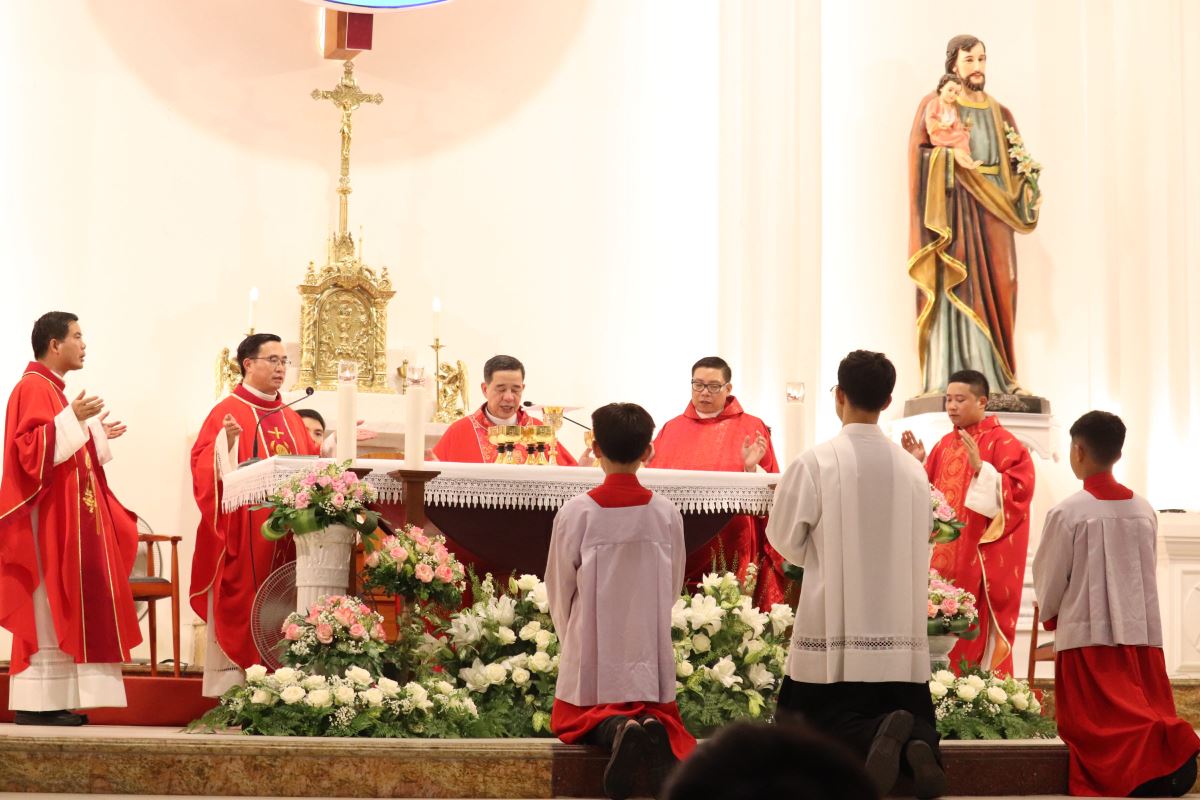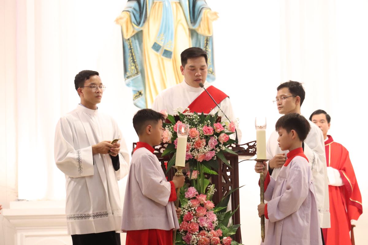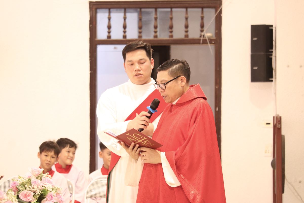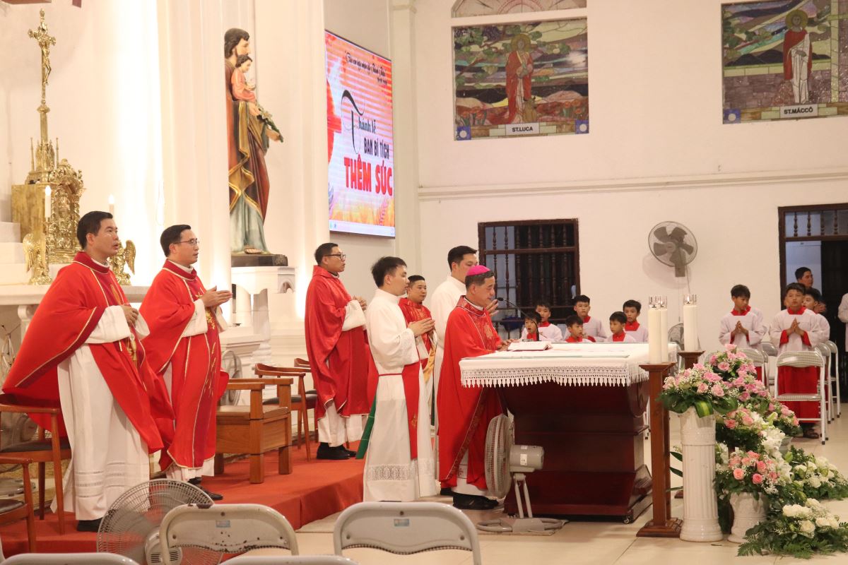 Lúc 19g30, Thánh lễ ban Bí tích Thêm Sức được cử hành do Đức cha Đaminh chủ sự. Đồng tế với ngài có cha xứ Antôn Vũ Thái San, cha phó Phêrô, quý Cha, cùng sự hiện diện của quý Thầy Phó tế, quý Thầy, quý Dì và đông đảo cộng đoàn dân Chúa.