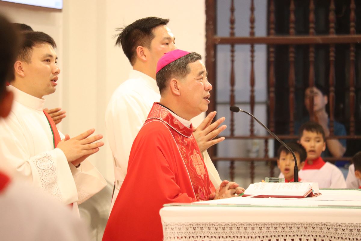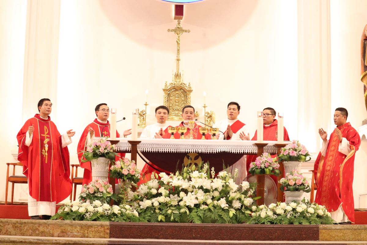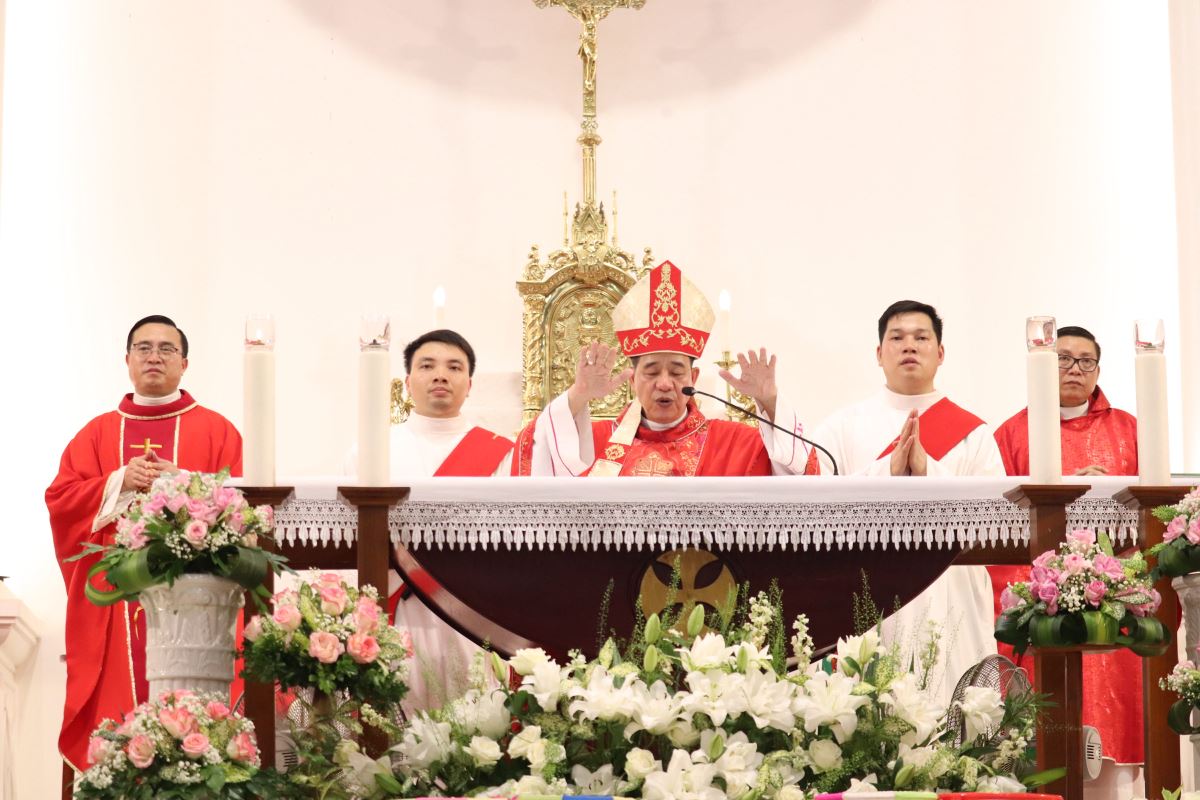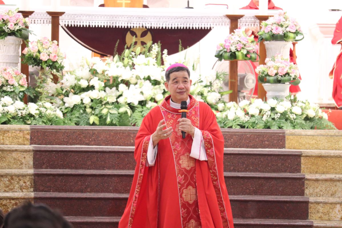 Mở đầu Thánh lễ, Đức cha mời gọi cộng đoàn hiệp dâng Thánh lễ cách sốt sắng, xin Chúa Thánh Thần canh tân tâm hồn mỗi người, đặc biệt cầu nguyện cho các em sắp lãnh nhận Bí tích Thêm Sức.