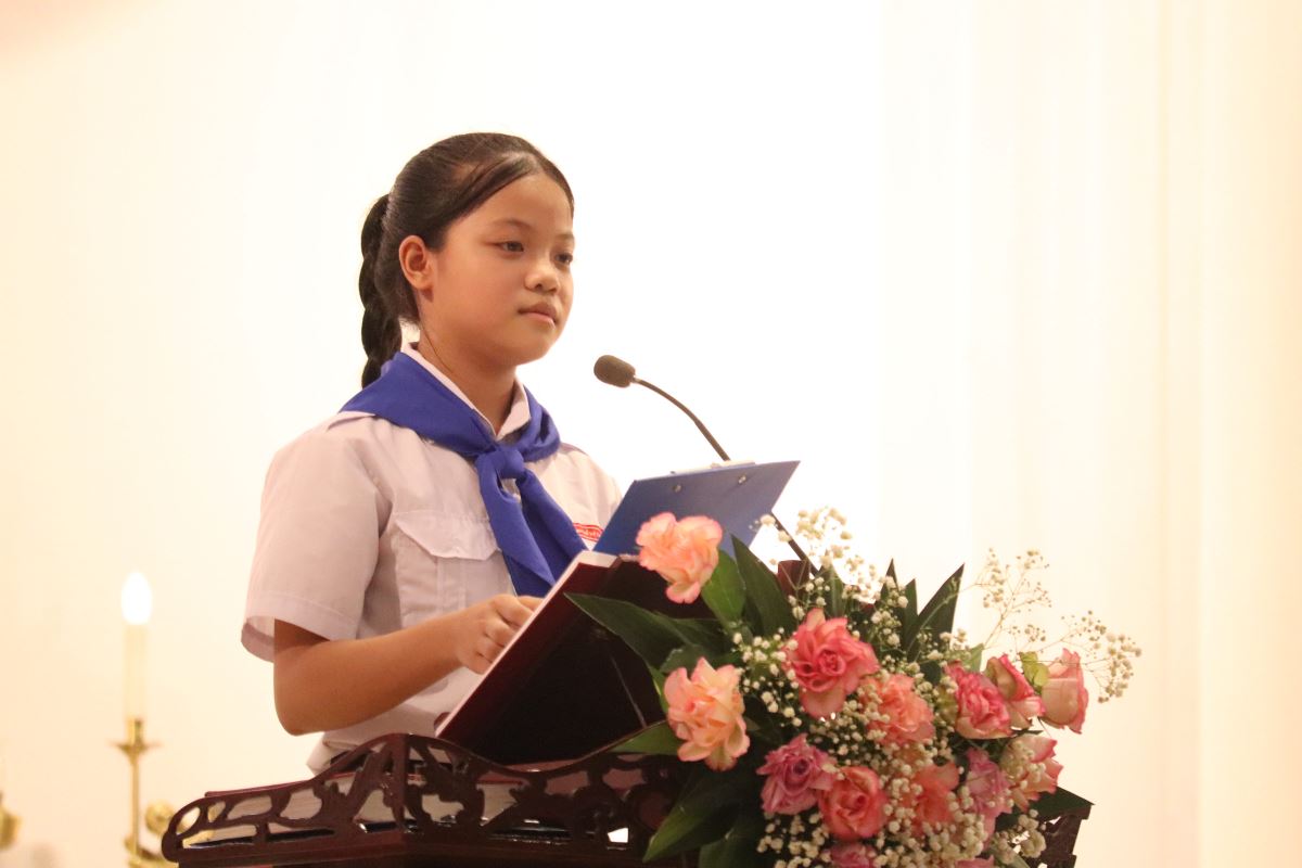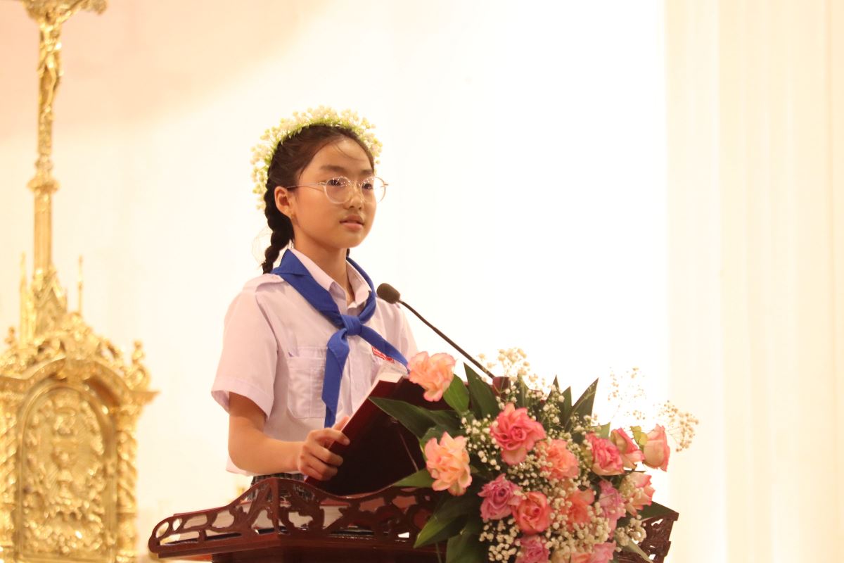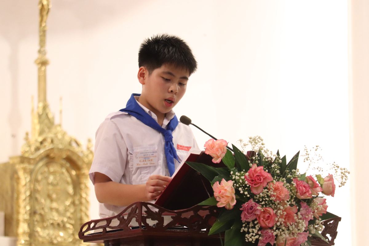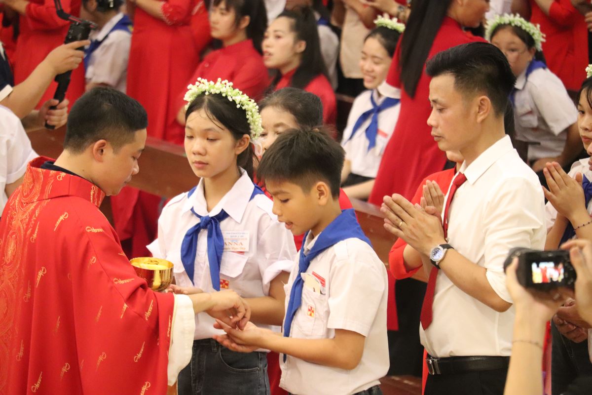 Sau lời nguyện hiệp lễ, một em đại diện dâng lời tạ ơn Thiên Chúa, tri ân Đức cha, quý Cha, quý tu sĩ, hội đồng giáo xứ, giáo lý viên, huynh trưởng, cha mẹ và cộng đoàn đã đồng hành, nâng đỡ và cầu nguyện cho các em.
