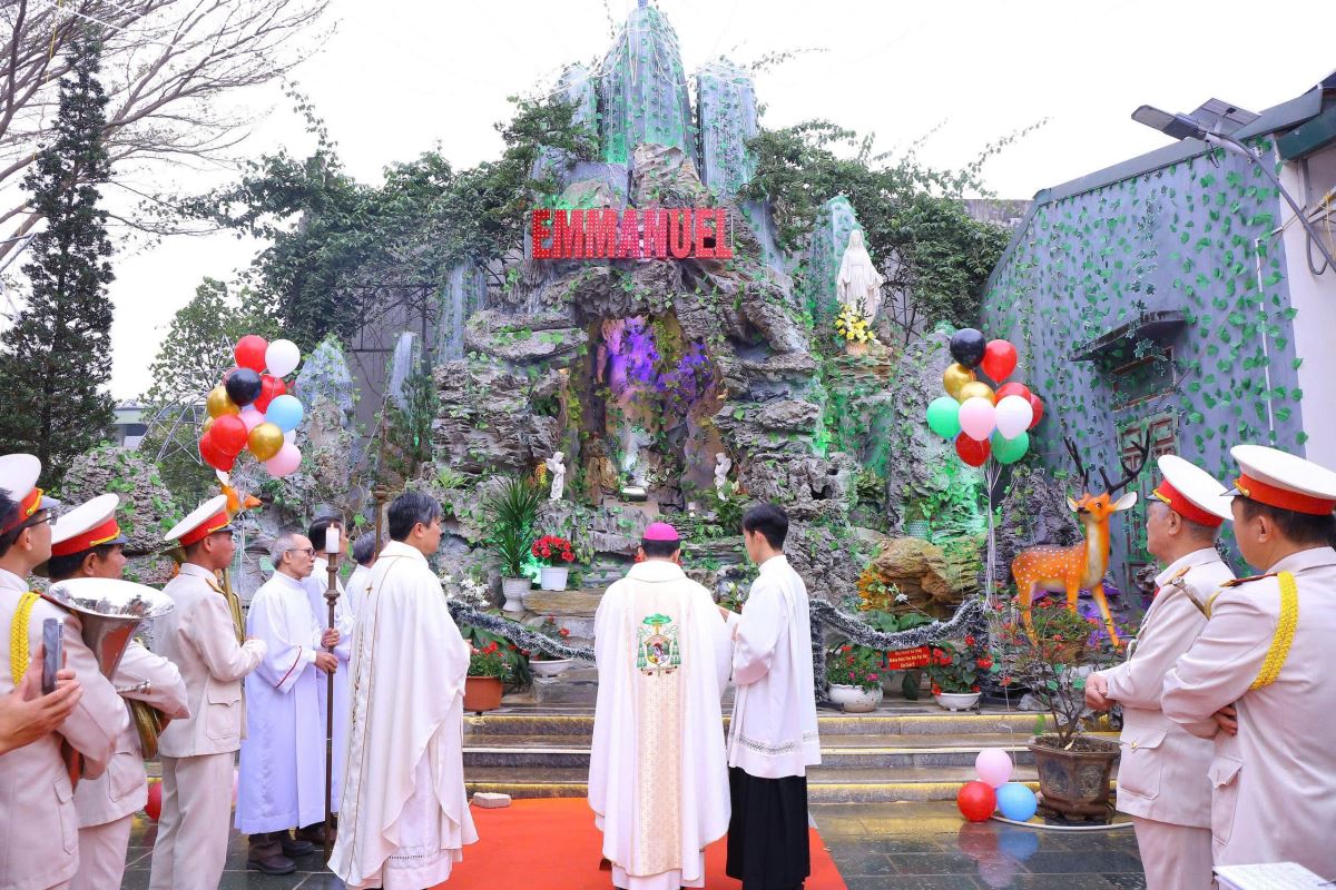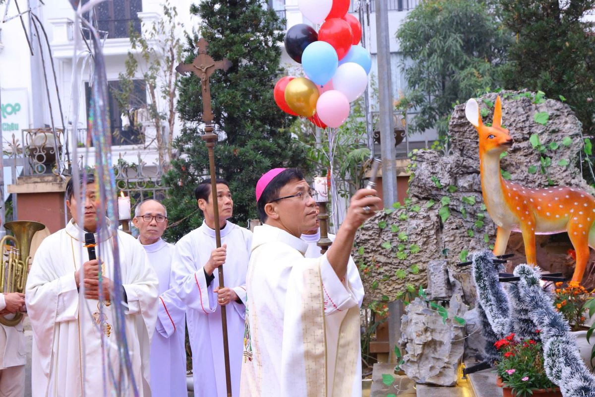Vào lúc 9g00, trong nghi thức làm phép hang đá kính Đức Mẹ Mân Côi, Đức cha Phaolô đã dâng lời cầu nguyện, xin Thiên Chúa chúc lành cho hang đá mà giáo họ đã nỗ lực thực hiện trong thời gian qua.