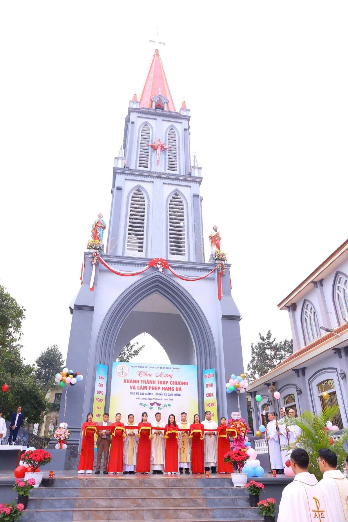 Sau đó là nghi thức làm phép tháp chuông với nghi thức cắt băng khánh thành. Khi dải băng khánh thành được cắt, những tràng pháo tay vang lên trong niềm xúc động, như lời tạ ơn chân thành dâng về Thiên Chúa – Đấng đã đồng hành và gìn giữ cộng đoàn qua bao thăng trầm.