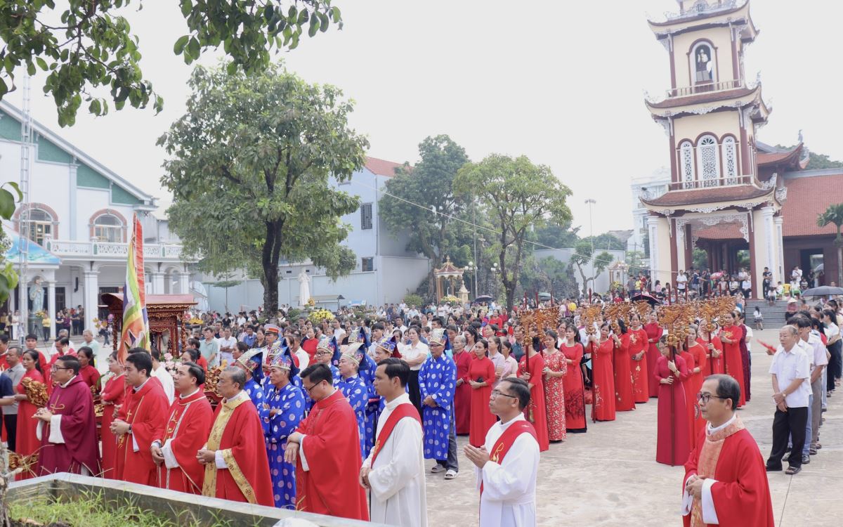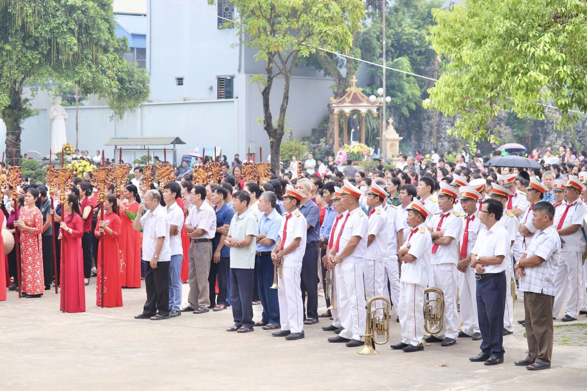 Sau nghi thức hành hương, cộng đoàn cùng cung nghinh kiệu Thánh Phêrô Lê Tuỳ quanh khuôn viên giáo xứ và tiến vào ngôi nhà Đa Năng của Giáo xứ để hiệp dâng Thánh lễ.