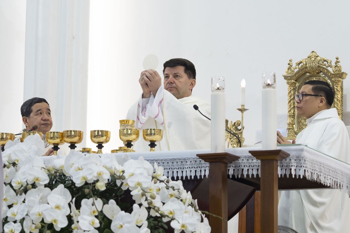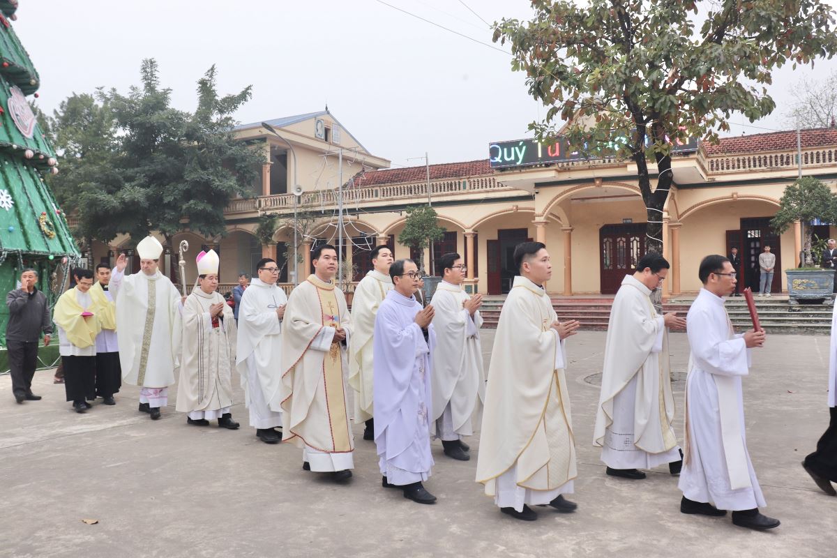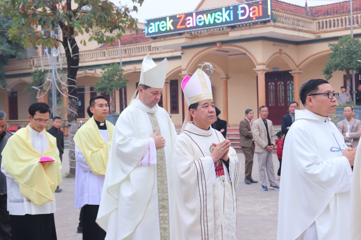 Đúng 16g30, đoàn đồng tế từ nhà mục vụ tiến vào Nhà Đa năng Giáo xứ để hiệp dâng Thánh lễ do Đức Tổng Giám mục Marek Zalewski chủ tế. Đồng tế với ngài có Đức cha Đaminh Hoàng Minh Tiến, Cha Quản hạt Antôn Vũ Thái San – Chính xứ Hoàng Xá, cùng quý cha trong Giáo hạt Tây Nam Phú Thọ.