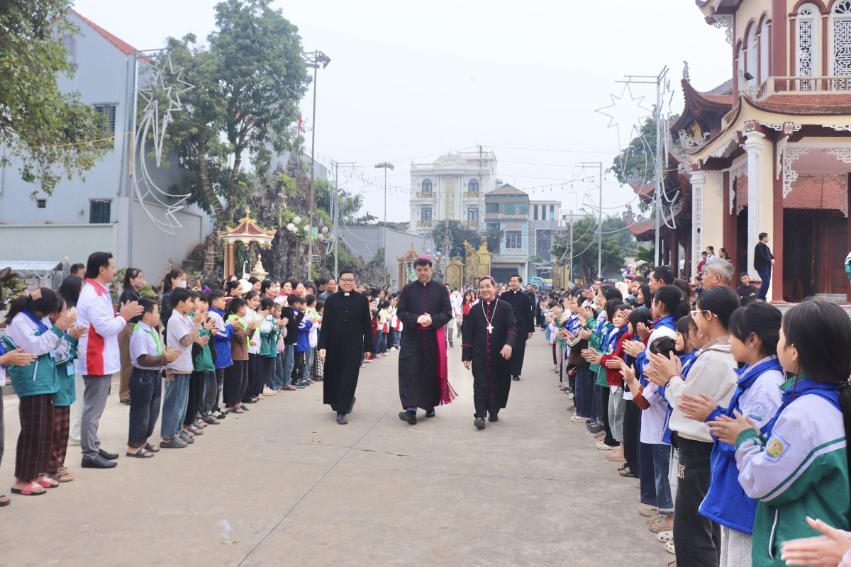 Vào lúc 15g45, các em thiếu nhi cùng cộng đoàn Dân Chúa trong giáo xứ đã hiện diện đông đủ, trật tự xếp thành hai hàng dài từ cổng tiến vào nhà mục vụ để long trọng chào đón Đức Tổng Giám mục Marek Zalewski. Trong bầu khí trang nghiêm và hân hoan, đúng 16g00, Đức Tổng Giám mục đã đến Giáo xứ Hoàng Xá. Cùng đi với ngài có Đức cha Đaminh Hoàng Minh Tiến – Giám mục Chính tòa Giáo phận Hưng Hóa. Đức Tổng và Đức cha tiến vào khuôn viên giáo xứ trong tiếng vỗ tay nồng nhiệt, chan chứa niềm vui và lòng kính mến của cộng đoàn dành cho các vị chủ chăn.