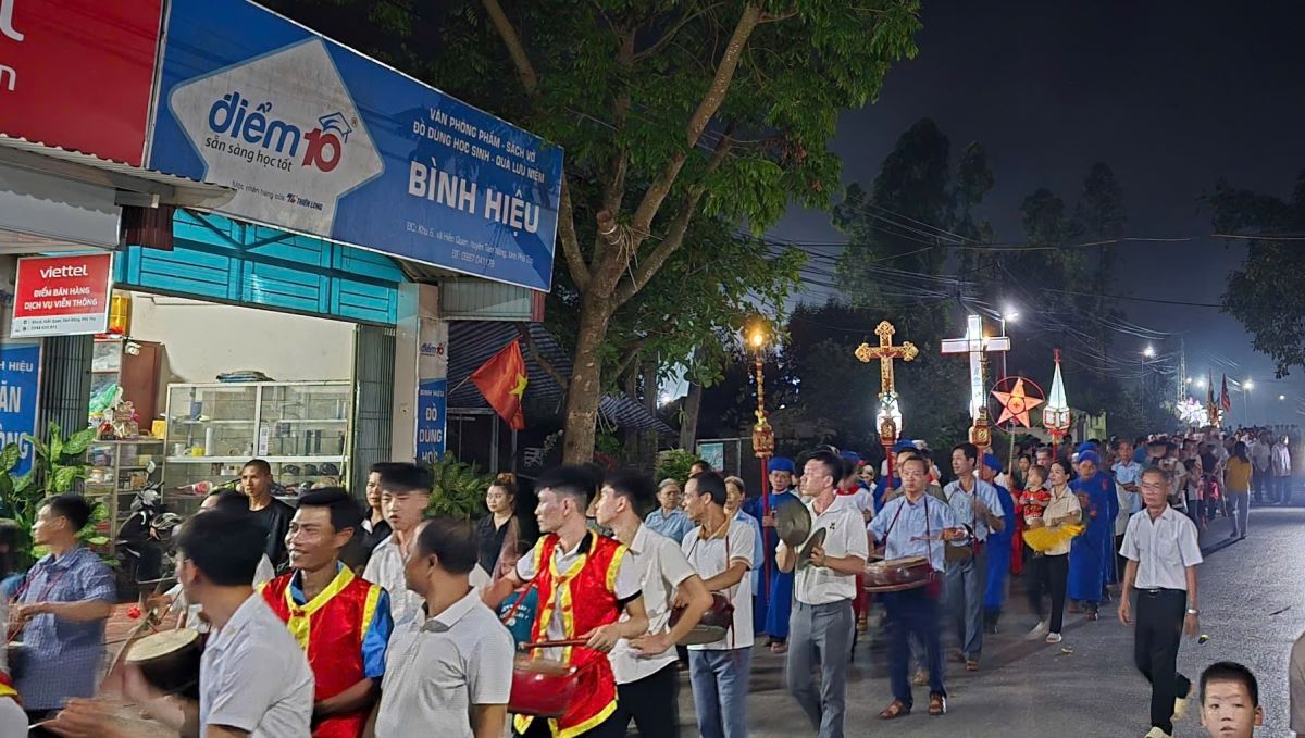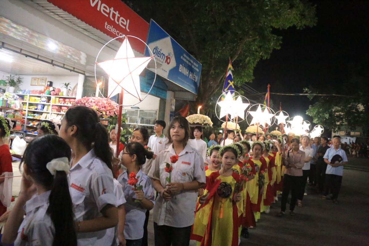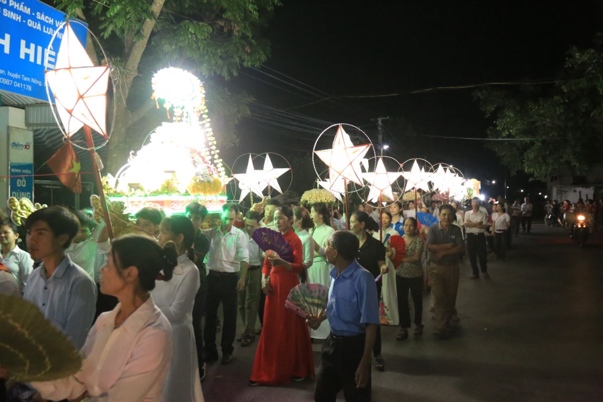 Sau thánh lễ, lúc 19g00, đoàn rước bắt đầu từ khuôn viên nhà thờ Thánh Giuse giáo họ Giữa Hiền, đi qua các con đường trong khu xóm, rồi tiến ra trục lộ ủy ban xã và về lại khuôn viên nhà thờ giáo họ Giữa Hiền. Đi đầu đoàn rước là đội trống của giáo xứ, Thánh Giá nến cao. Tiếp đến là các em thiếu nhi, các hội đoàn, bà con giáo dân, và những kiệu hoa được xen kẽ giữa các hội đoàn, cuối cùng là kiệu Đức Mẹ. Đoàn rước đi trong sự nghiêm trang của bà con giáo dân hòa cùng những lời kinh, tiếng hát để cùng nói lên lòng tôn kính với Mẹ Maria.