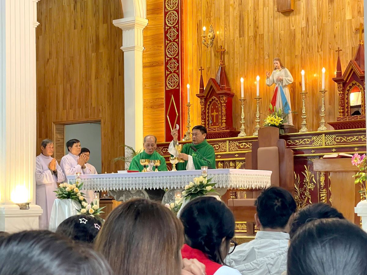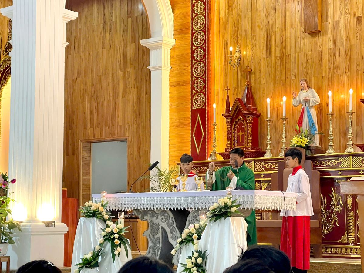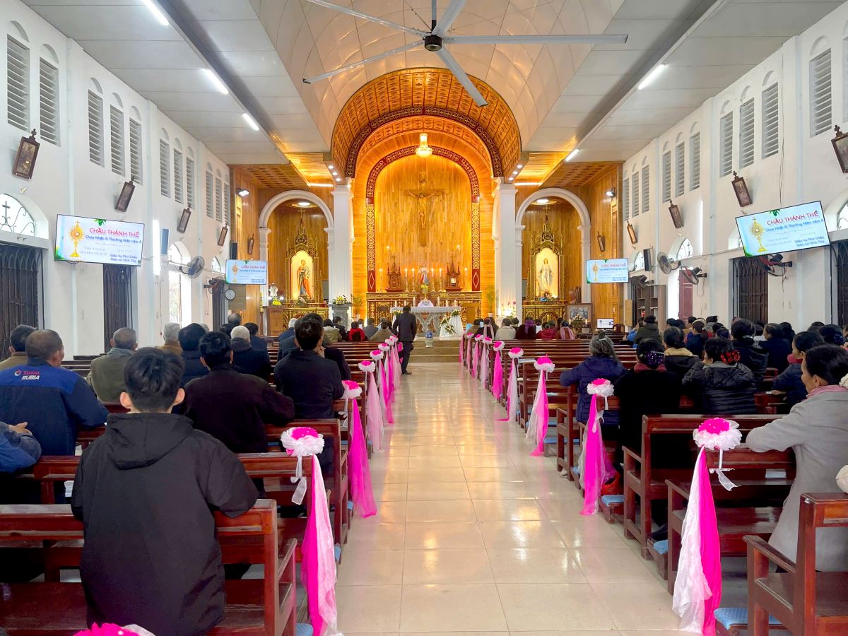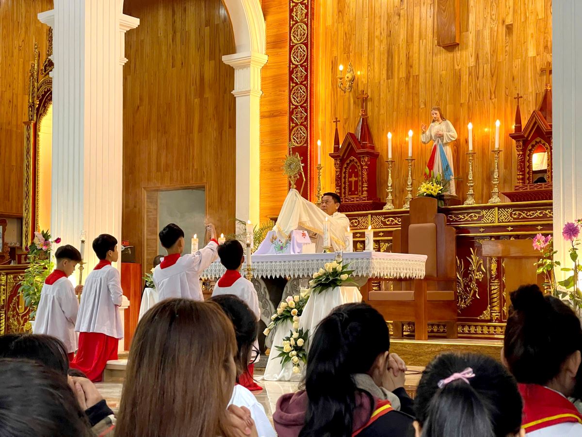 Cao điểm của ngày chầu là Thánh lễ đồng tế lúc 10g15, do Cha xứ Giuse Nguyễn Văn Ninh chủ sự. Đồng tế với ngài có Cha cố Giuse Nguyễn Thái Hà, cùng sự hiện diện hiệp thông của quý tu sĩ và đông đảo tín hữu đến từ các giáo xứ, giáo họ lân cận.