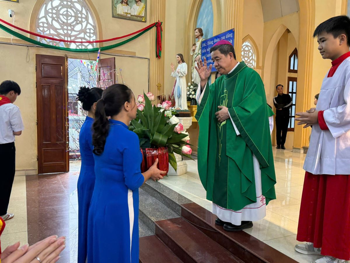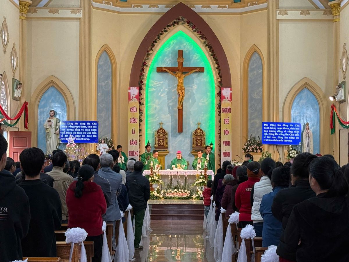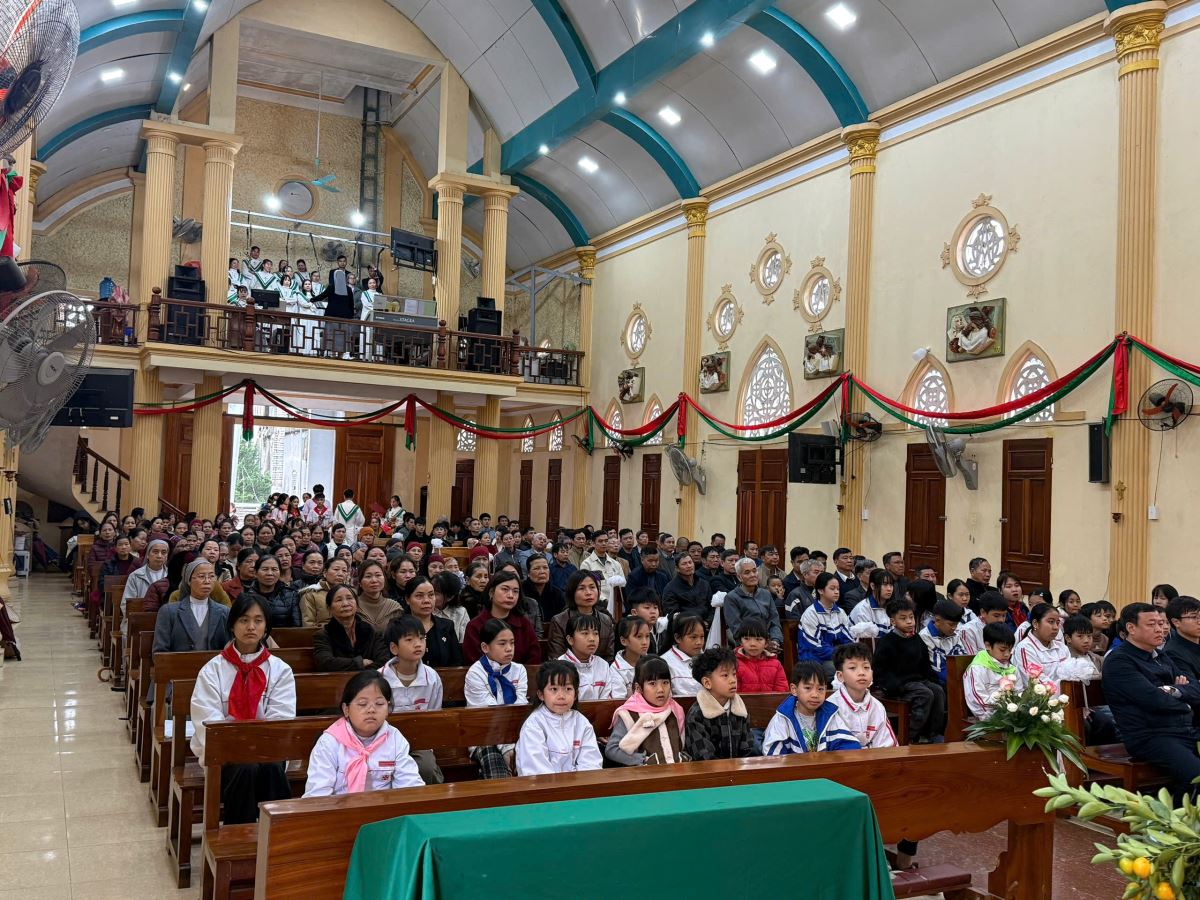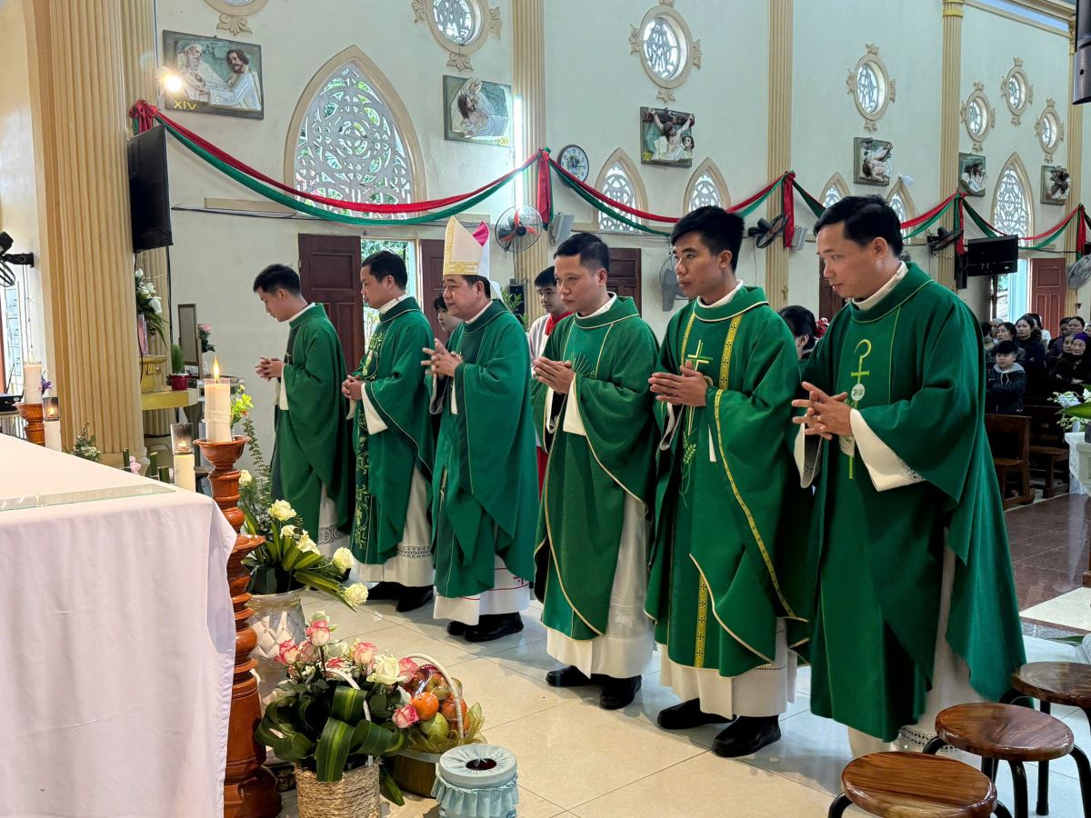 Kết thúc giờ chầu chung, vào lúc 10g00, Thánh lễ Chúa nhật V Thường Niên được cử hành trọng thể do Đức cha Đaminh Hoàng Minh Tiến chủ sự. Đồng tế với ngài có cha xứ Giuse, quý cha phó và quý cha đến từ Giáo phận Lạng Sơn.