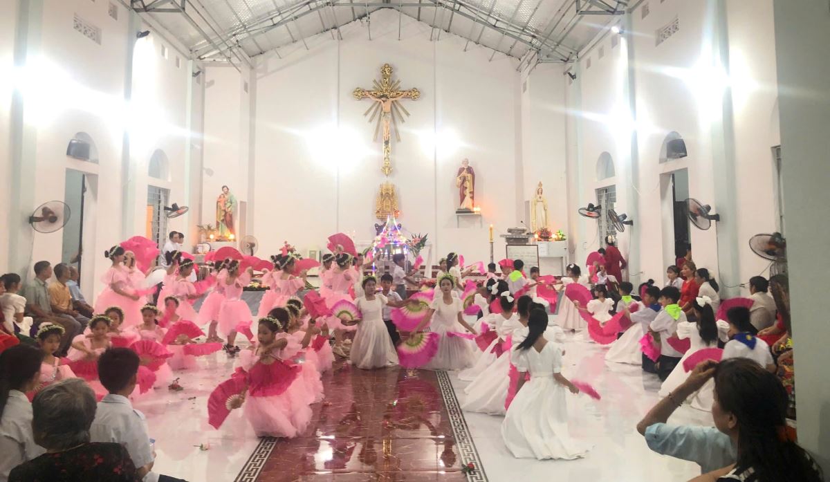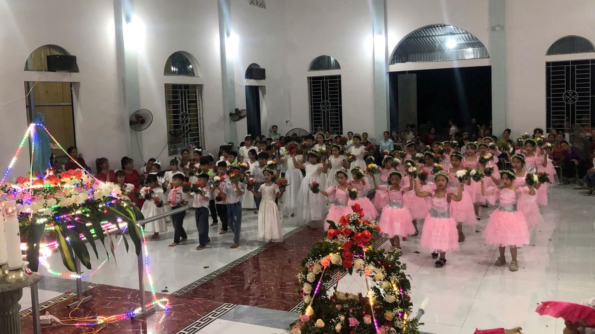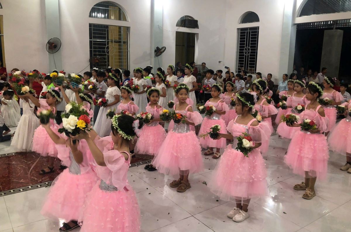 dâng hoa kính Đức Mẹ. Những động tác uyển chuyển, nét mặt ngây thơ trong sáng, những bó hoa nhỏ bé nhưng chân thành... tất cả gói trọn tấm lòng yêu mến mà các em dâng lên Mẹ Maria – người Mẹ dịu hiền.