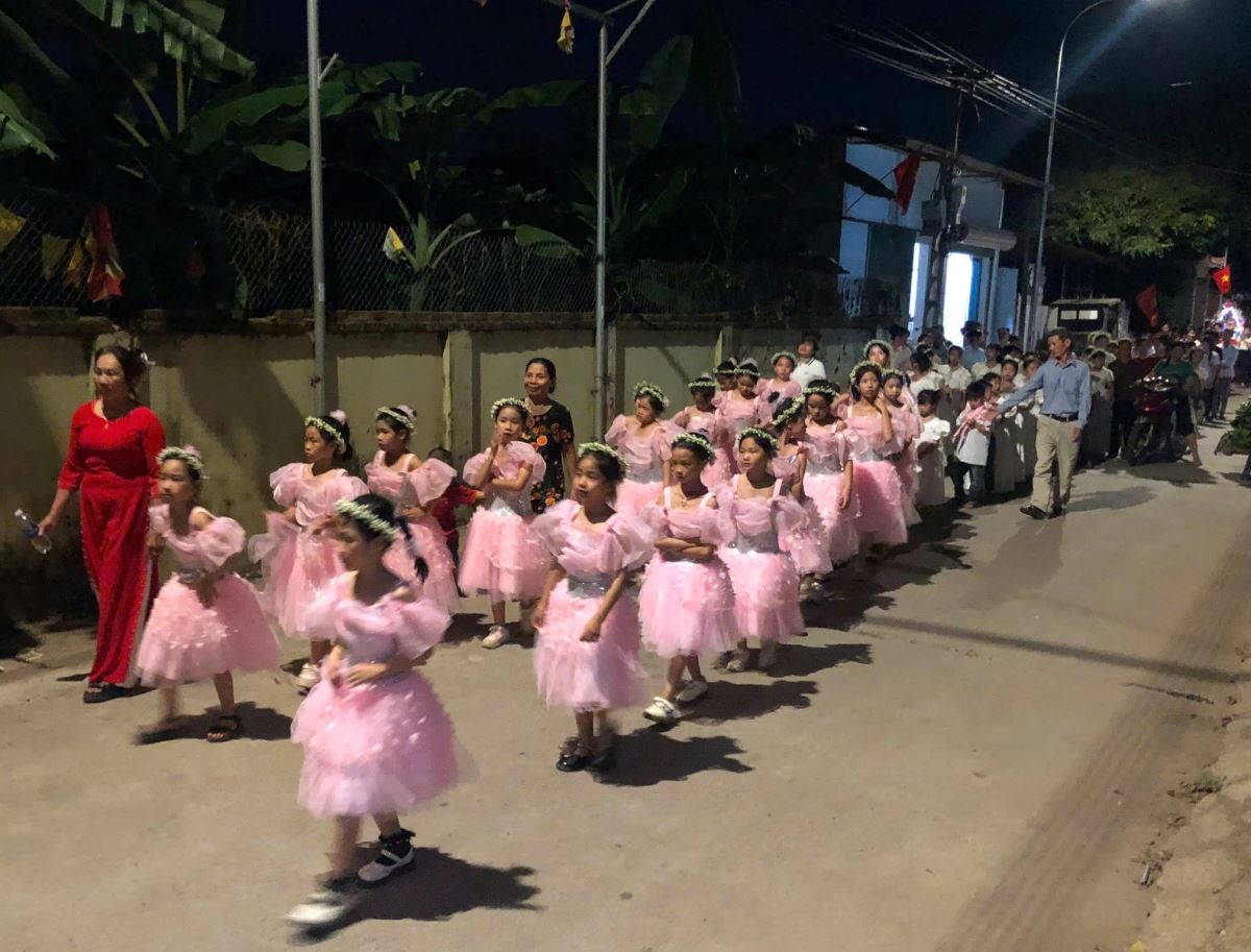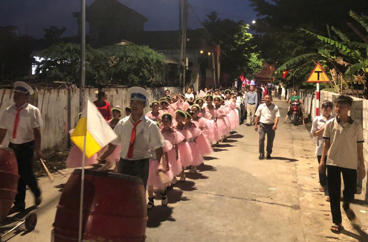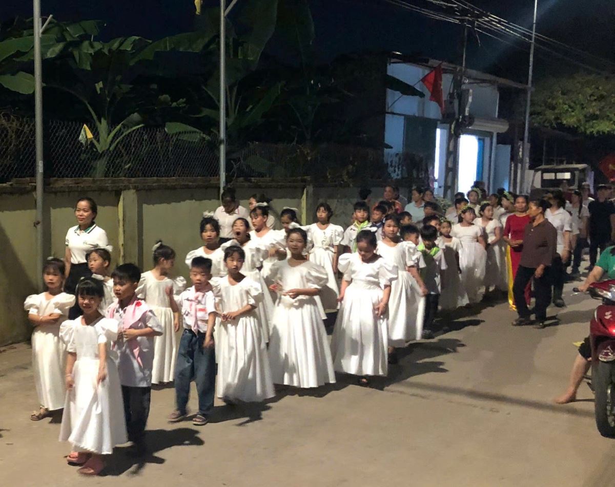 Trong tiếng trống vang ngân và lời kinh Mân Côi sốt sắng, đoàn rước kiệu hoa bắt đầu khởi hành từ nhà thờ giáo họ, tiến bước qua các ngả đường trong thôn làng. Hình ảnh kiệu Đức Mẹ được trang trí bằng hoa tươi rực rỡ, hòa cùng sắc phục chỉnh tề của các đoàn hội, các em thiếu nhi và cộng đoàn dân Chúa tiến bước một cách nghiêm trang đã làm bừng sáng bầu khí đức tin nơi miền quê yên bình. Mỗi bước chân của đoàn rước như mang theo lời nguyện cầu cho từng gia đình, từng tâm hồn – xin Mẹ ban ơn chữa lành, hoán cải, gìn giữ bình an và mở lối cho Tin Mừng lan tỏa.